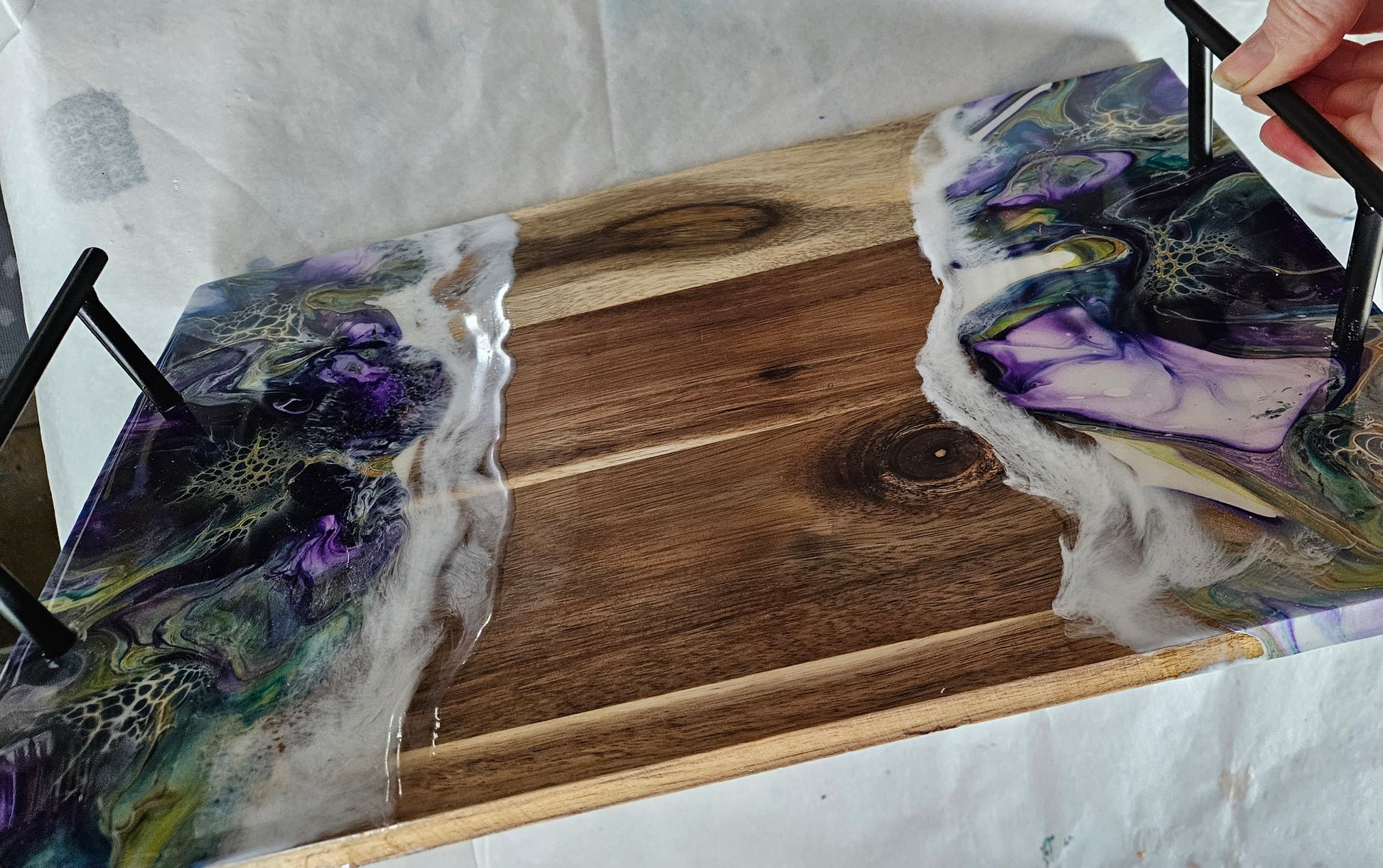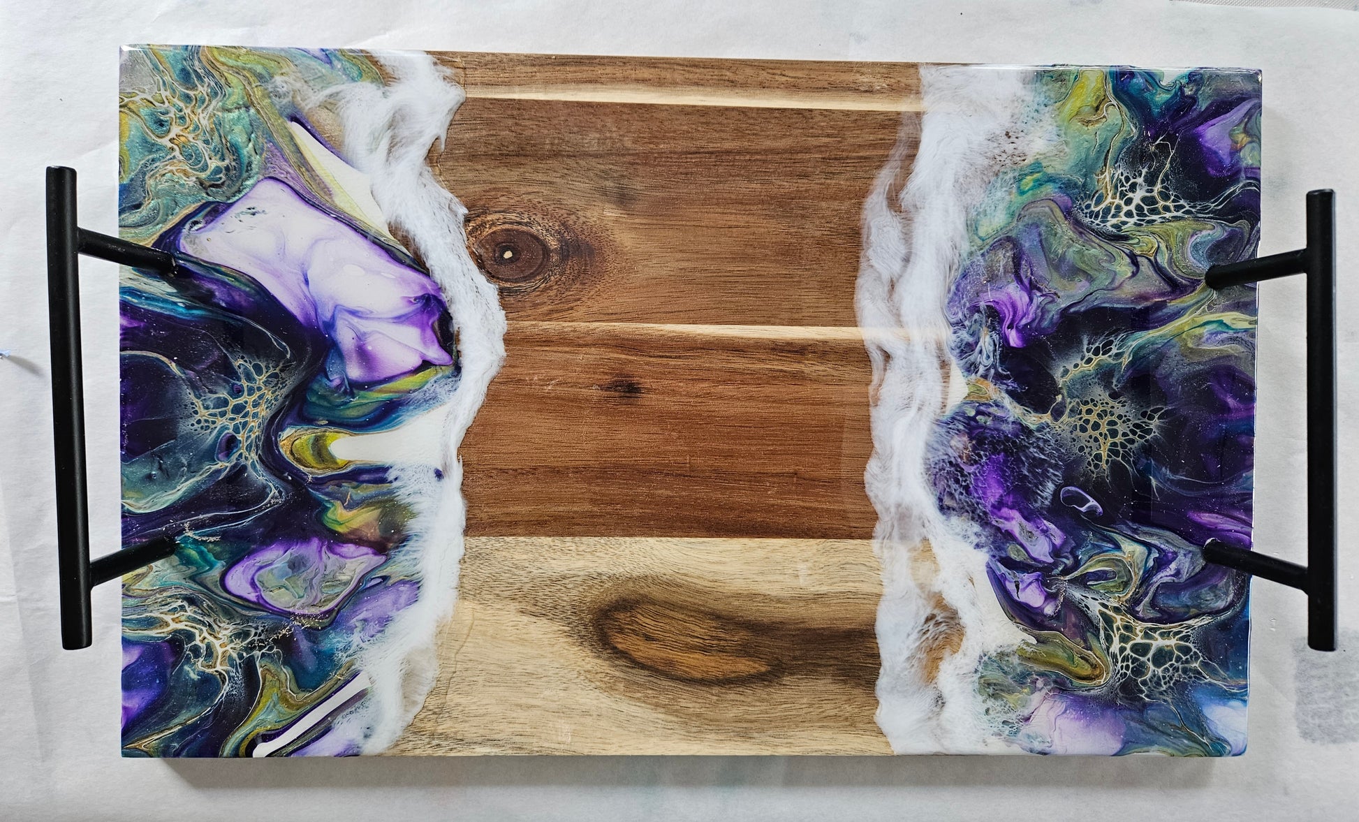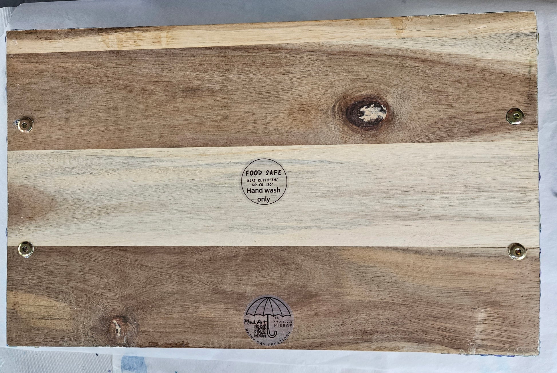We protect the paint with a high heat, art grade resin, which can take heat up to 475 degrees Fahrenheit. Do not cut on the resin. Wipe the resin with a soft cloth. Windex works well to clean the resin. If needed, you can recondition the wood using mineral oil.