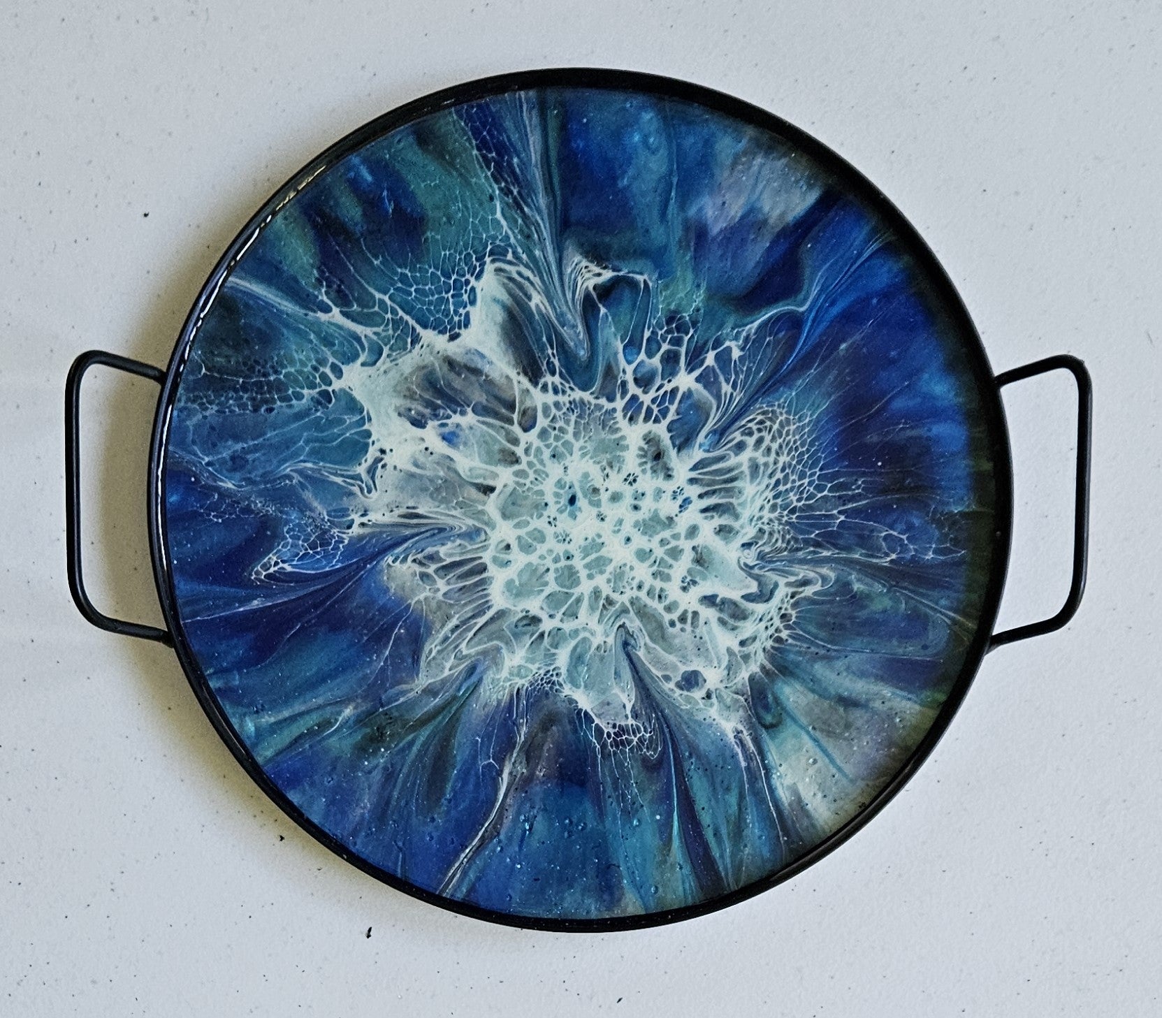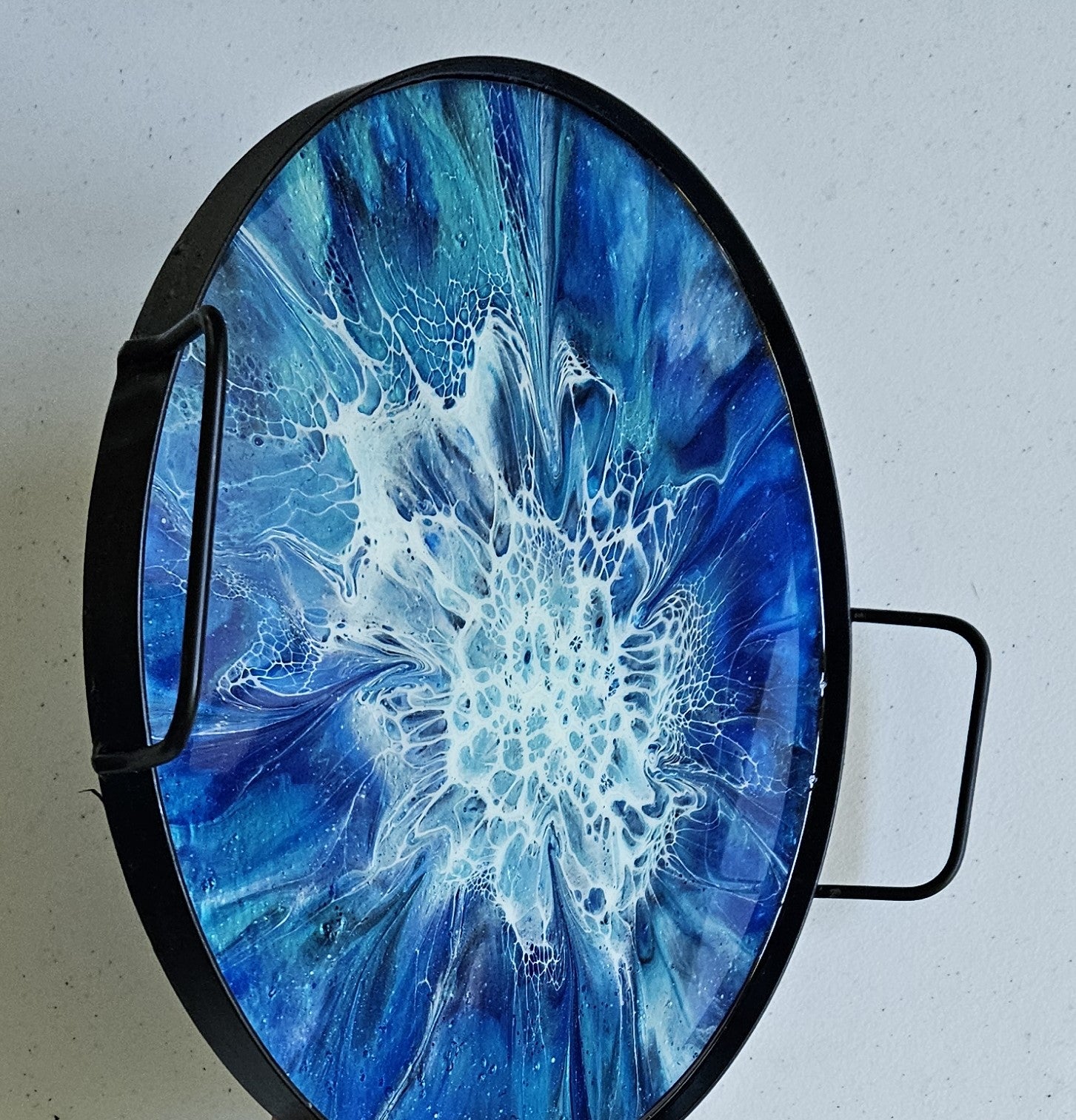 The round trays have a metal frame and a wooden base. We protect the paint with a high heat, art grade resin, which can take heat up to 475 degrees Fahrenheit. Do not cut on the resin. Wipe the resin with a soft cloth. Windex works well to clean the resin.