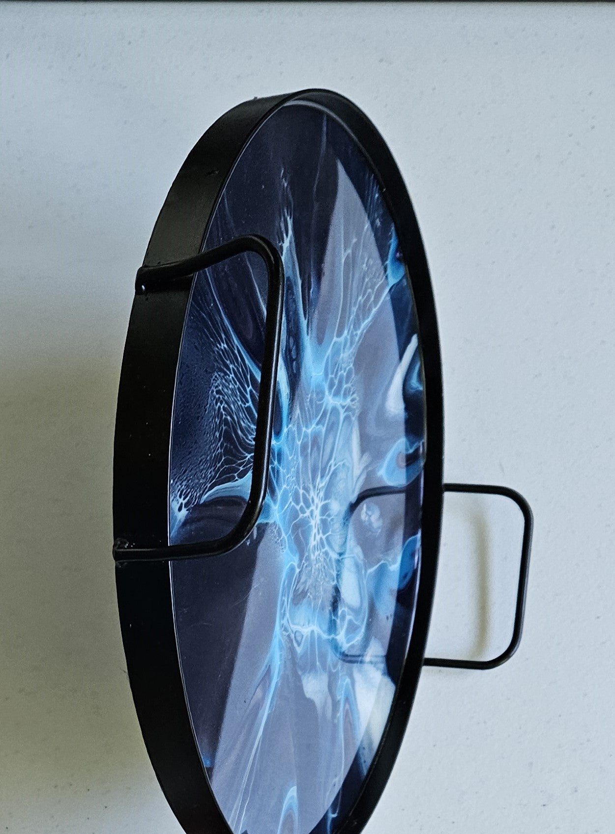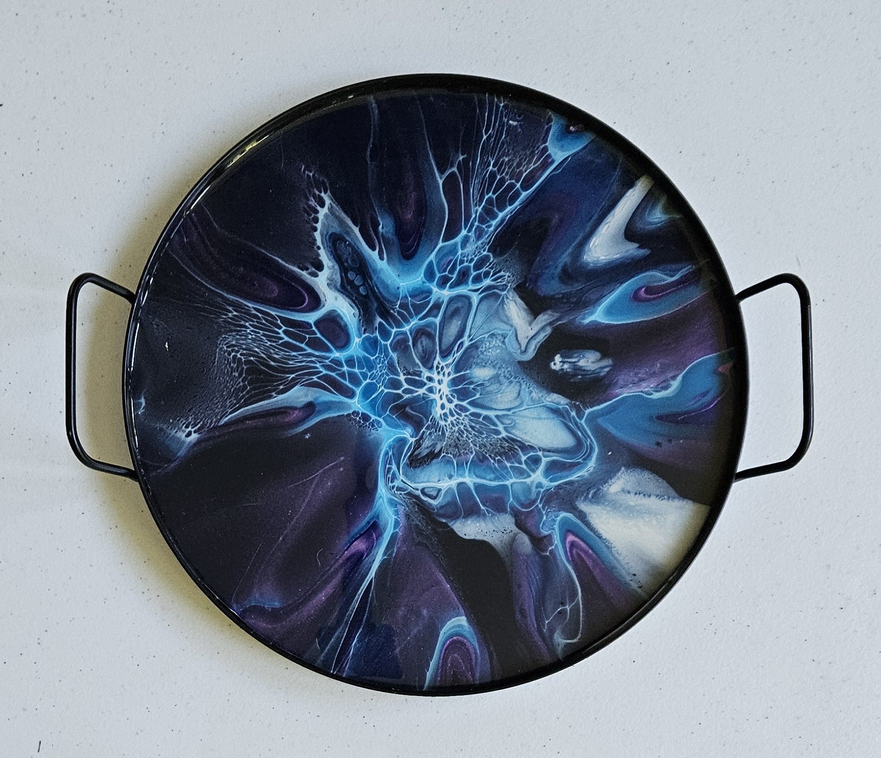 The round trays have a metal frame and a wooden base. We protect the paint with a high heat, art grade resin, which can take heat up to 475 degrees Fahrenheit. Do not cut on the resin. Wipe the resin with a soft cloth. Windex works well to clean the resin.