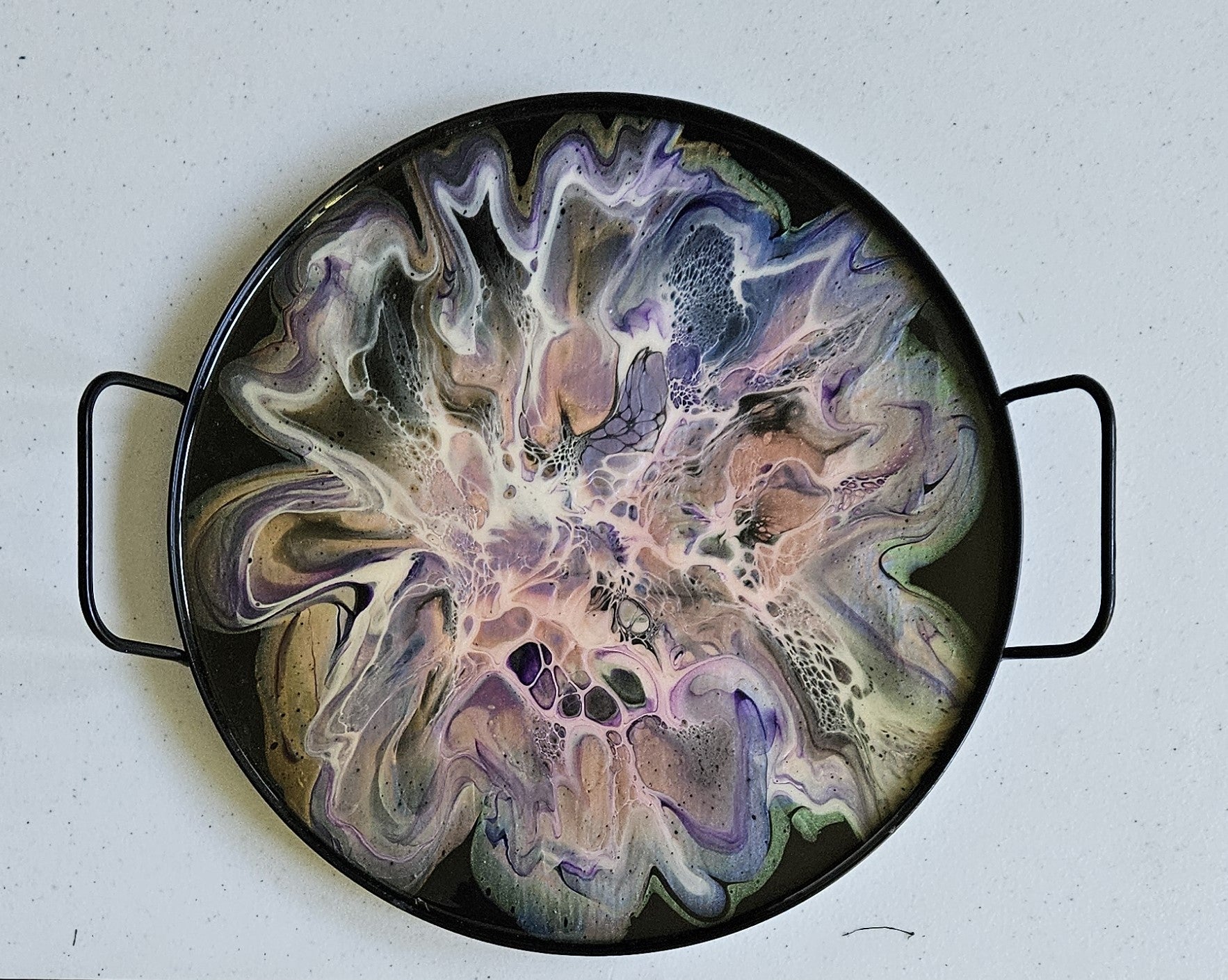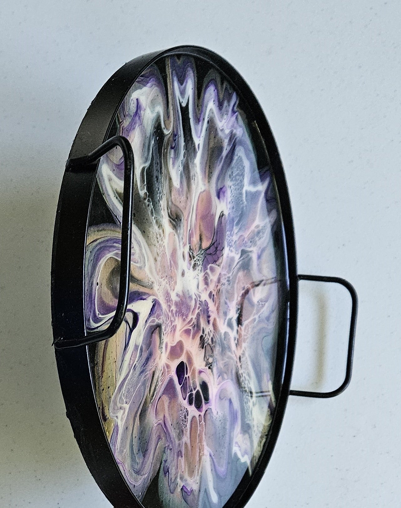 The round trays have a metal frame and a wooden base. We protect the paint with a high heat, art grade resin, which can take heat up to 475 degrees Fahrenheit. Do not cut on the resin. Wipe the resin with a soft cloth. Windex works well to clean the resin.