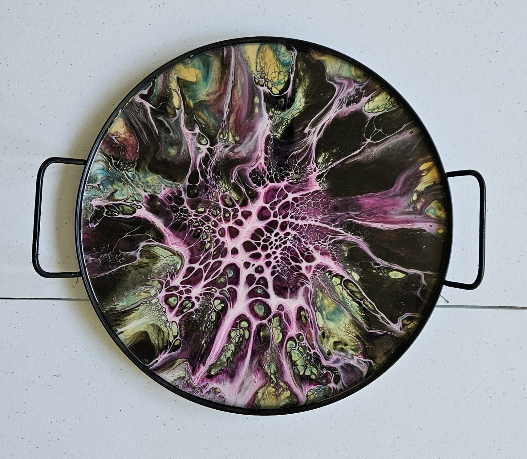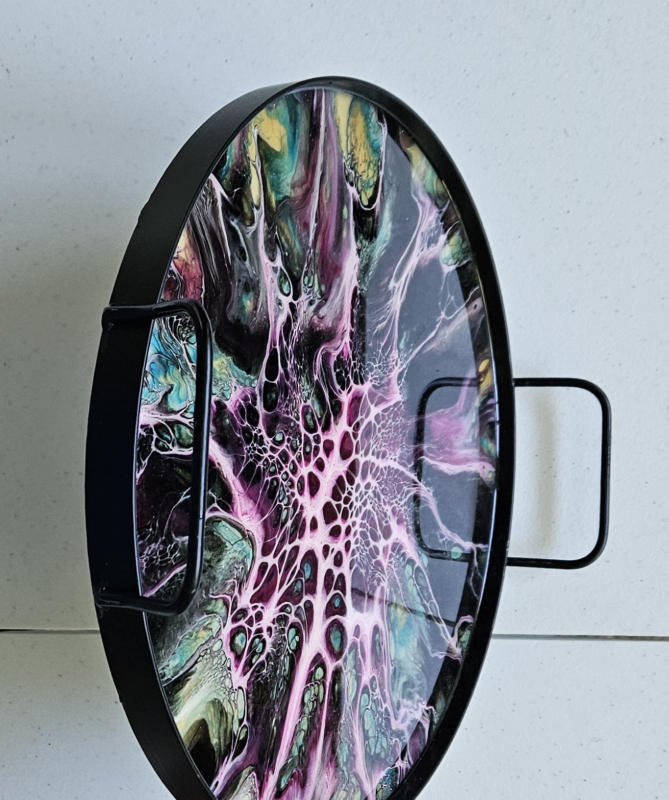 The round trays have a metal frame and a wooden base. We protect the paint with a high heat, art grade resin, which can take heat up to 475 degrees Fahrenheit. Do not cut on the resin. Wipe the resin with a soft cloth. Windex works well to clean the resin.