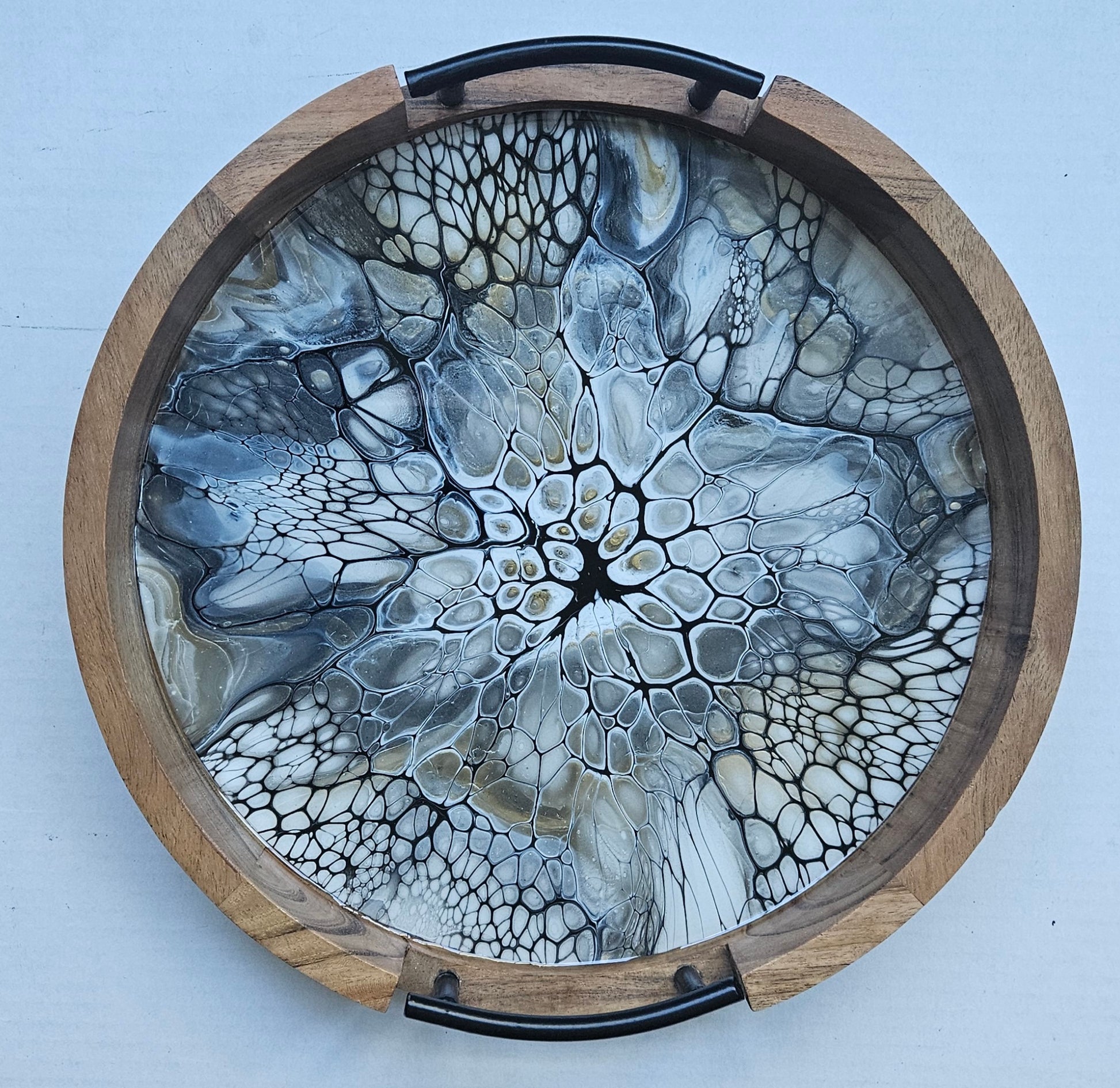 The round trays have a metal frame and a wooden base. We protect the paint with a high heat, art grade resin, which can take heat up to 475 degrees Fahrenheit. Do not cut on the resin. Wipe the resin with a soft cloth. Windex works well to clean the resin.