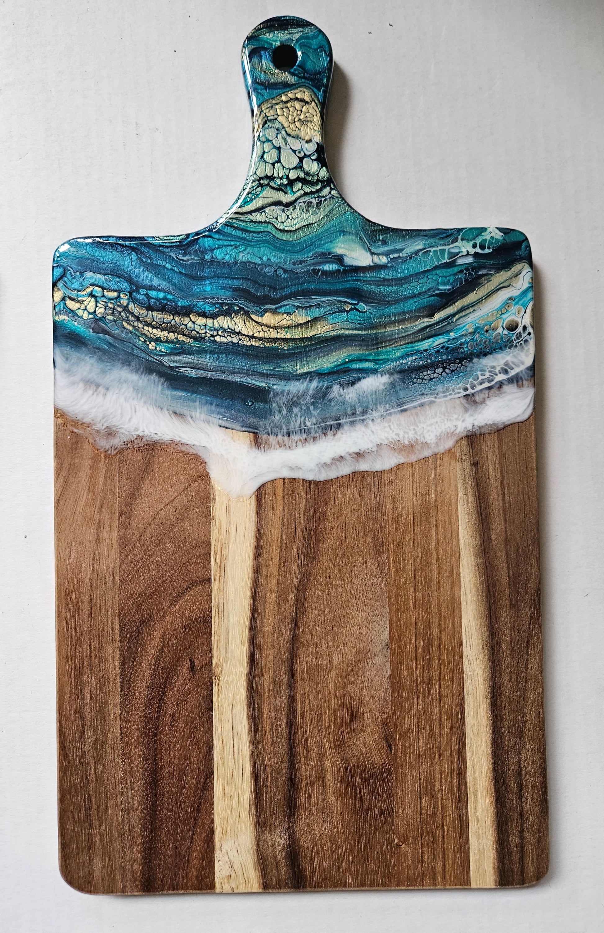 We apply fluid art on the end of the charcuterie and protect the art with a food safe, art grade resin. The resin can take heat up to 120 degrees Fahrenheit. Do not cut on the resin. Hand wash. After washing, you can recondition the wood using a food safe mineral oil. Windex works well to clean the resin.