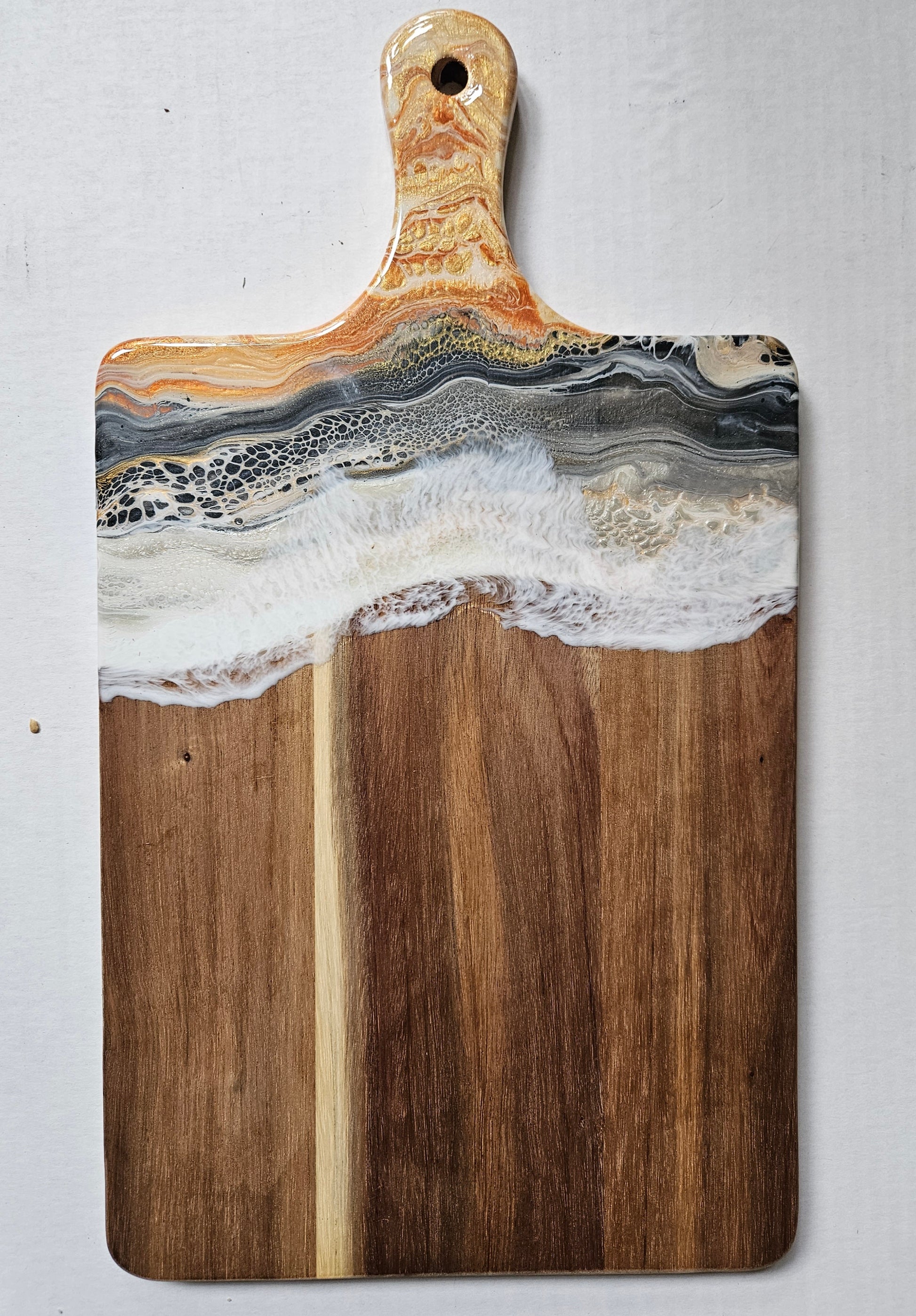 We apply fluid art on the end of the charcuterie and protect the art with a food safe, art grade resin. The resin can take heat up to 120 degrees Fahrenheit. Do not cut on the resin. Hand wash. After washing, you can recondition the wood using a food safe mineral oil. Windex works well to clean the resin.