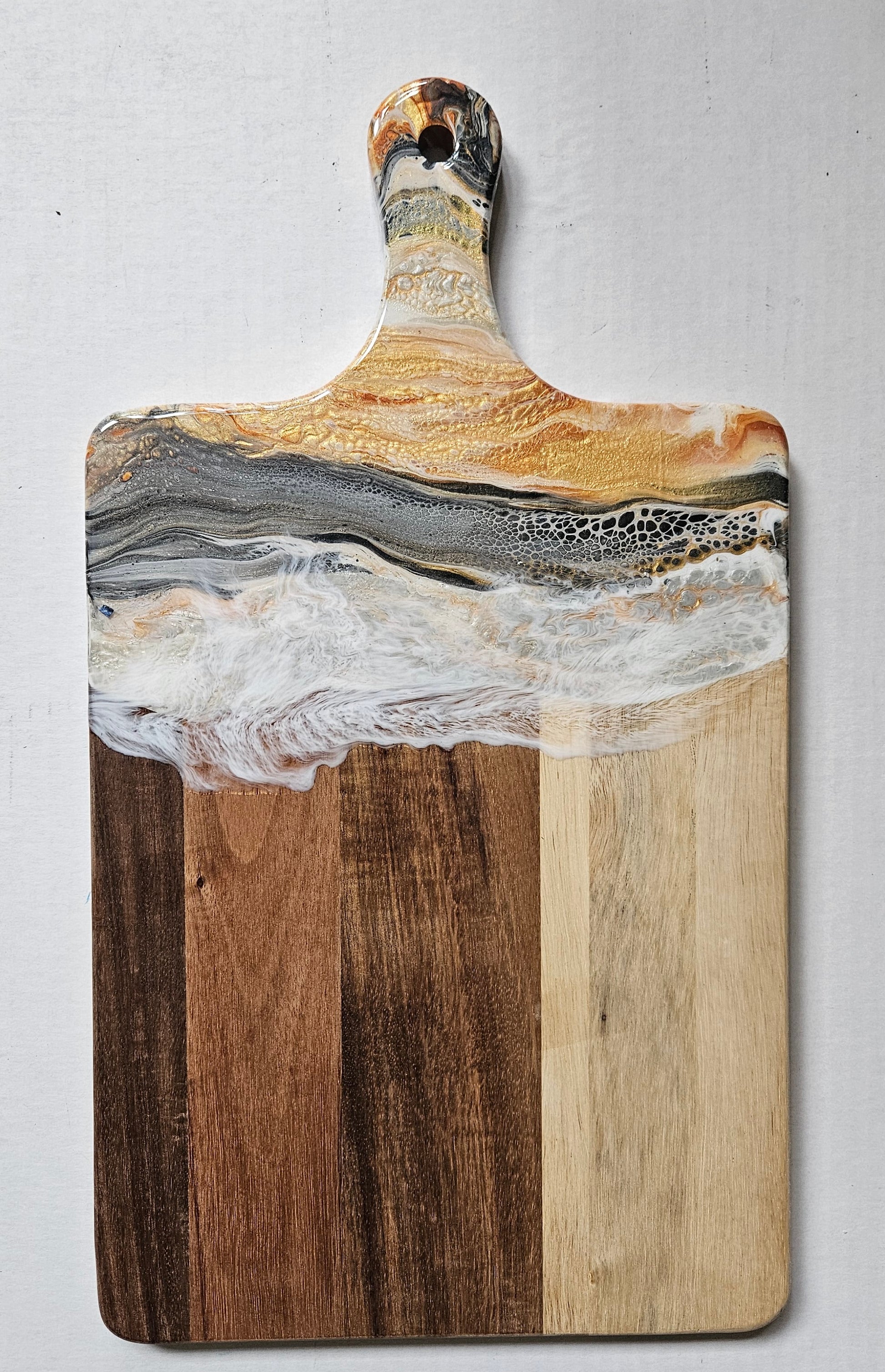 We apply fluid art on the end of the charcuterie and protect the art with a food safe, art grade resin. The resin can take heat up to 120 degrees Fahrenheit. Do not cut on the resin. Hand wash. After washing, you can recondition the wood using a food safe mineral oil. Windex works well to clean the resin.