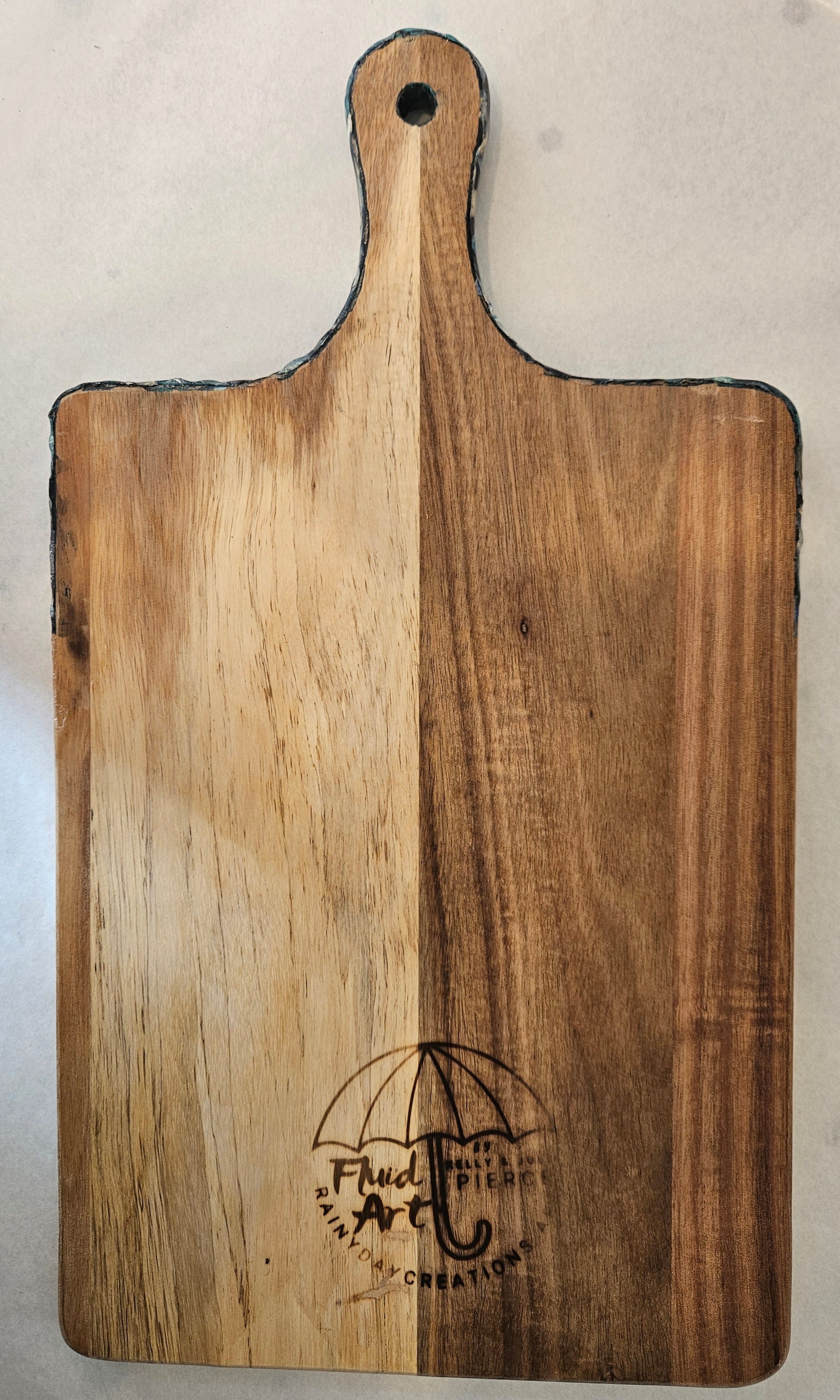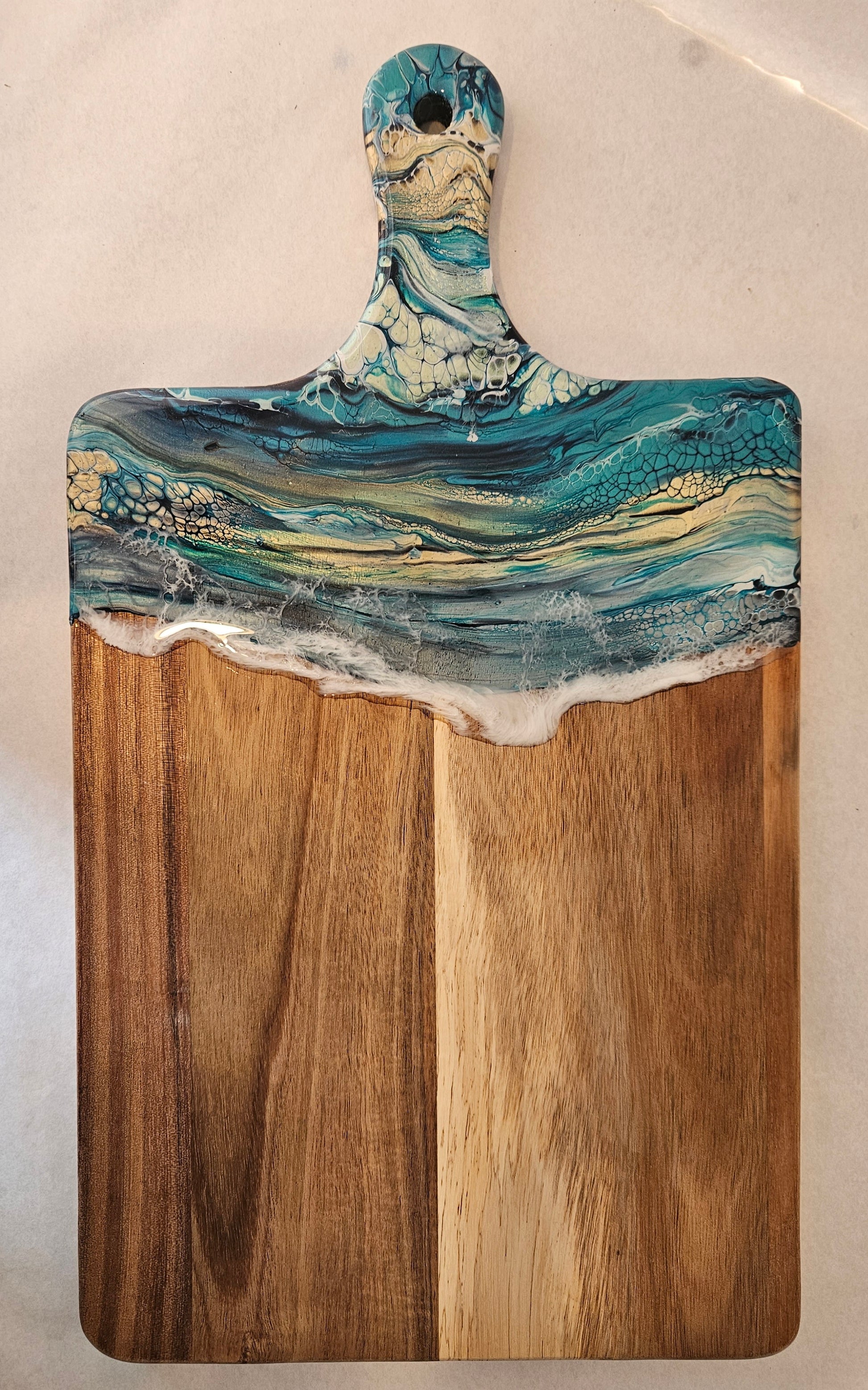 We apply fluid art on the end of the charcuterie and protect the art with a food safe, art grade resin. The resin can take heat up to 120 degrees Fahrenheit. Do not cut on the resin. Hand wash. After washing, you can recondition the wood using a food safe mineral oil. Windex works well to clean the resin.