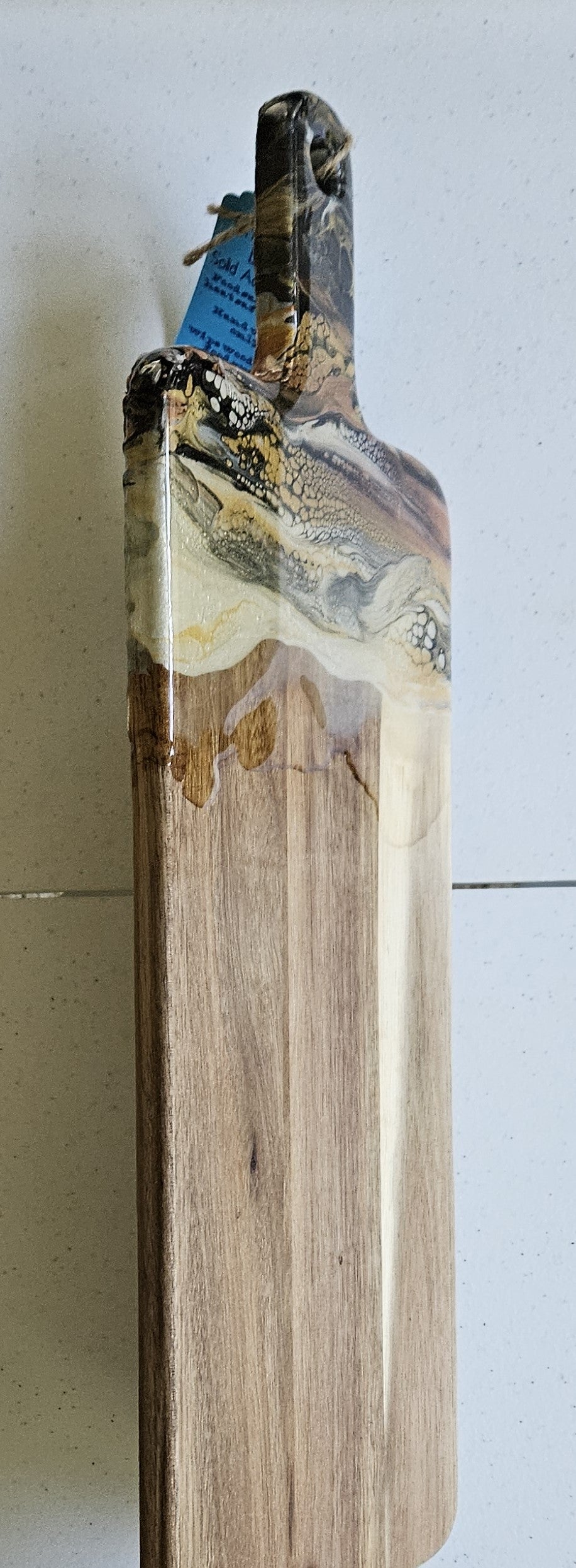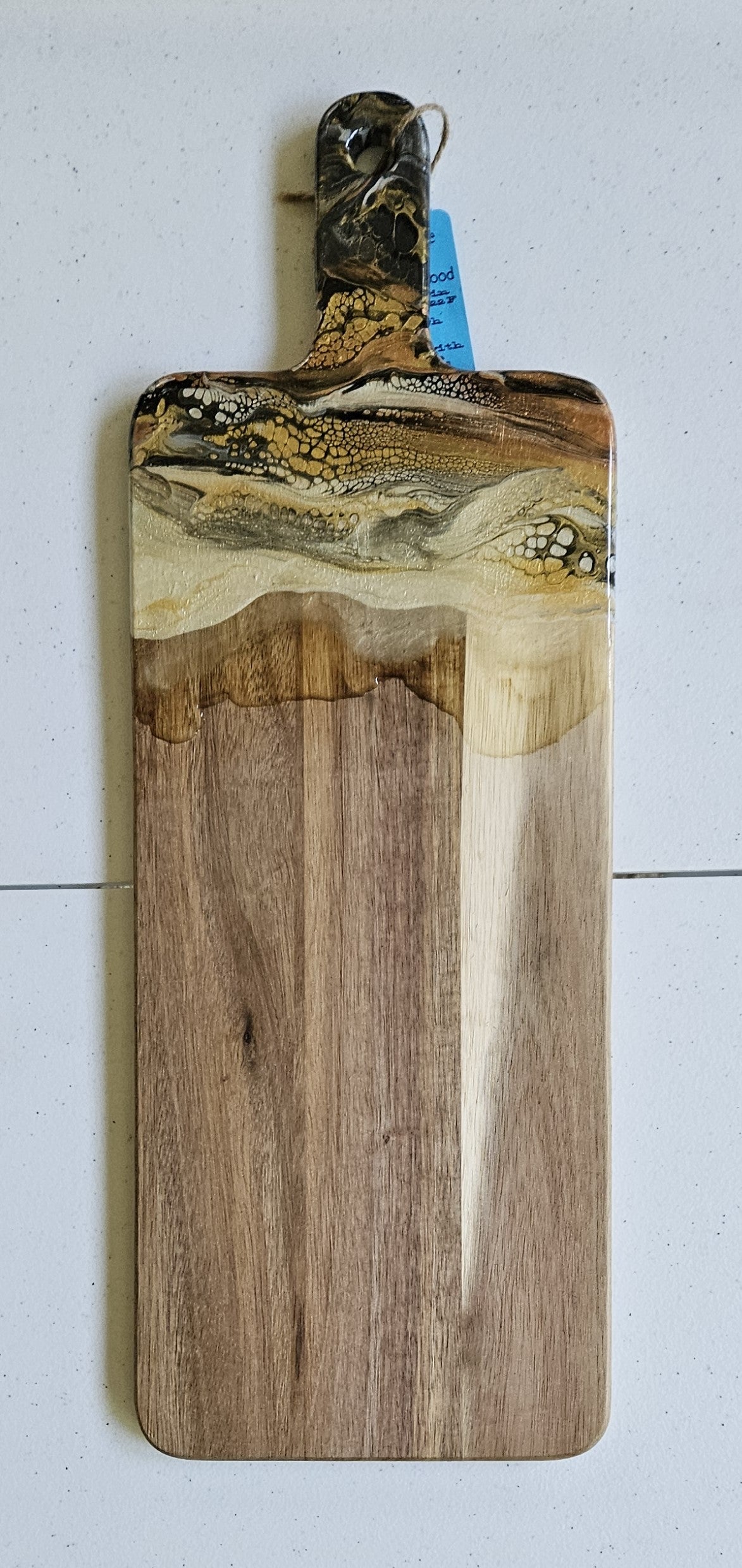We apply fluid art on the end of the charcuterie and protect the art with a food safe, art grade resin. The resin can take heat up to 120 degrees Fahrenheit. Do not cut on the resin. Hand wash. After washing, you can recondition the wood using a food safe mineral oil. Windex works well to clean the resin.