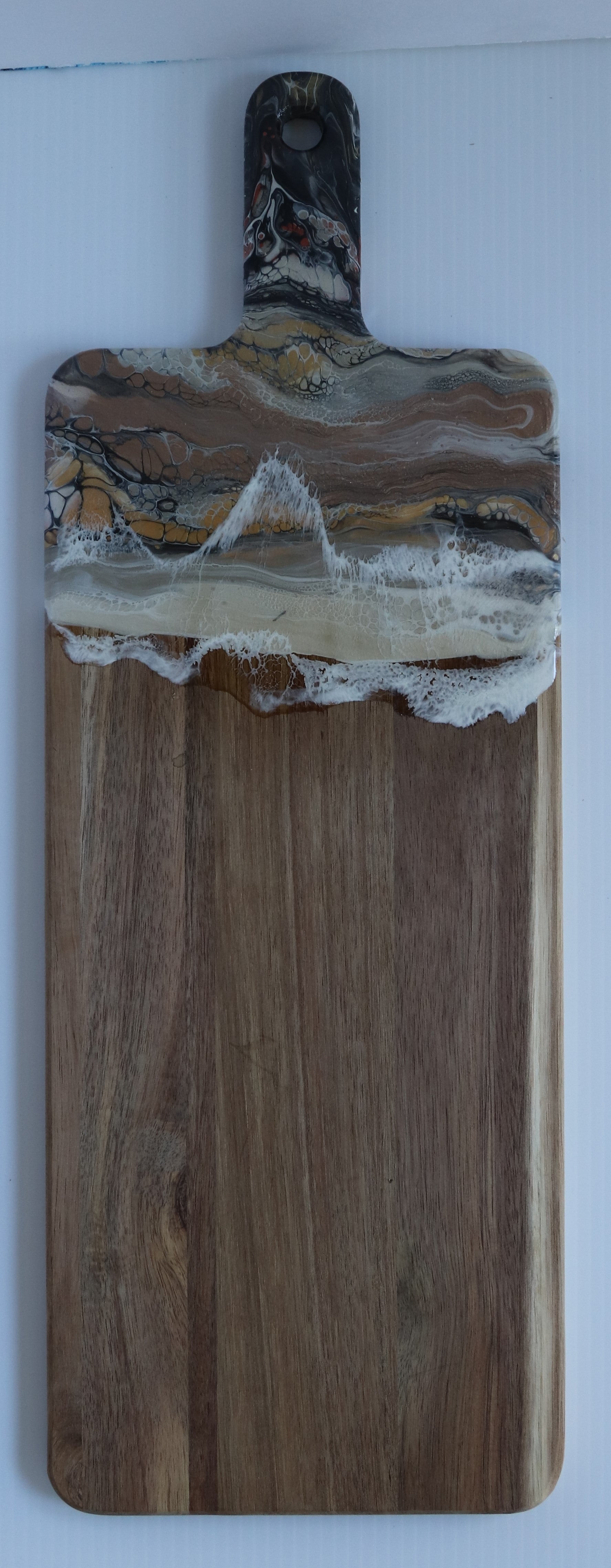 We apply fluid art on the end of the charcuterie and protect the art with a food safe, art grade resin. The resin can take heat up to 120 degrees Fahrenheit. Do not cut on the resin. Hand wash. After washing, you can recondition the wood using a food safe mineral oil. Windex works well to clean the resin.