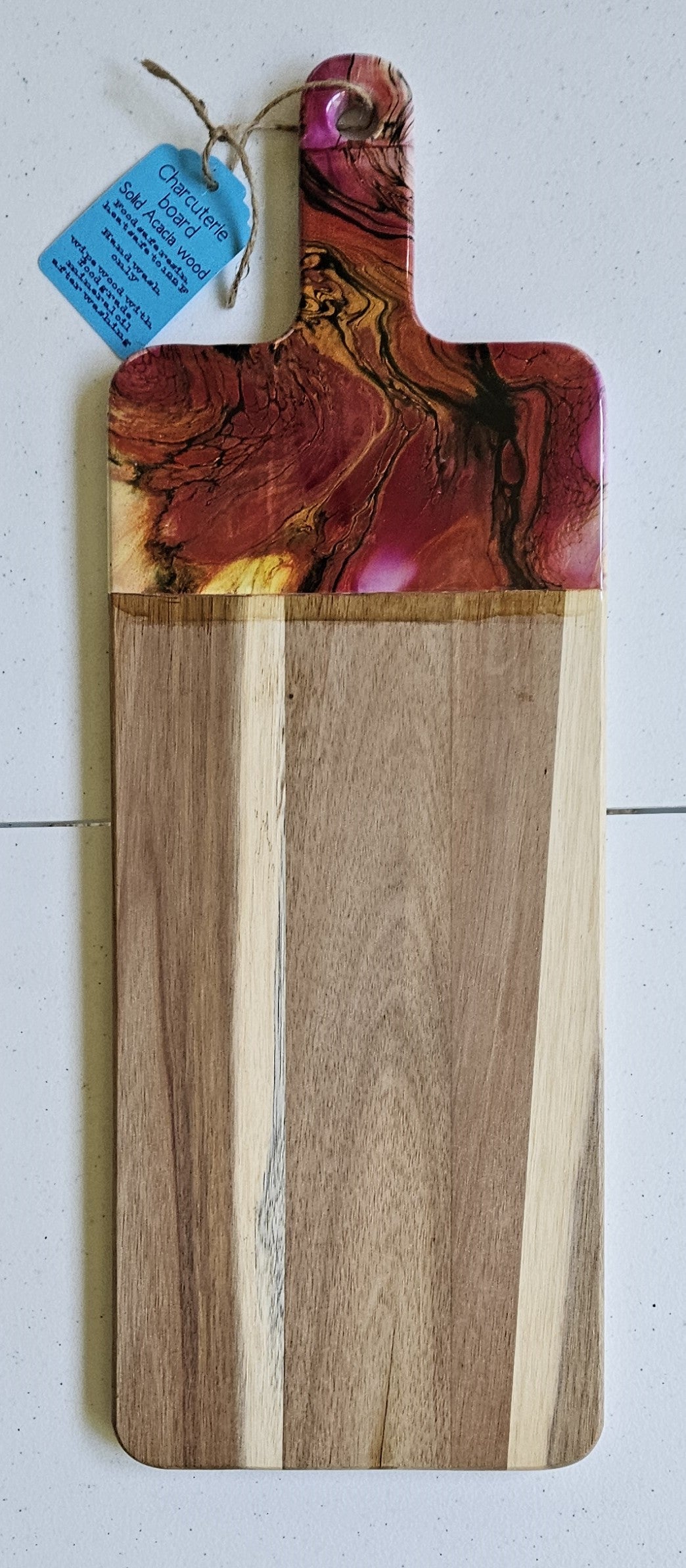 We apply fluid art on the end of the charcuterie and protect the art with a food safe, art grade resin. The resin can take heat up to 120 degrees Fahrenheit. Do not cut on the resin. Hand wash. After washing, you can recondition the wood using a food safe mineral oil. Windex works well to clean the resin.