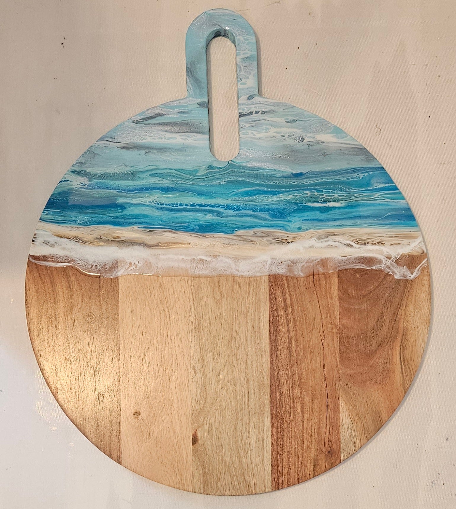 We apply fluid art on the end of the charcuterie and protect the art with a food safe, art grade resin. The resin can take heat up to 120 degrees Fahrenheit. Do not cut on the resin. Hand wash. After washing, you can recondition the wood using a food safe mineral oil. Windex works well to clean the resin.