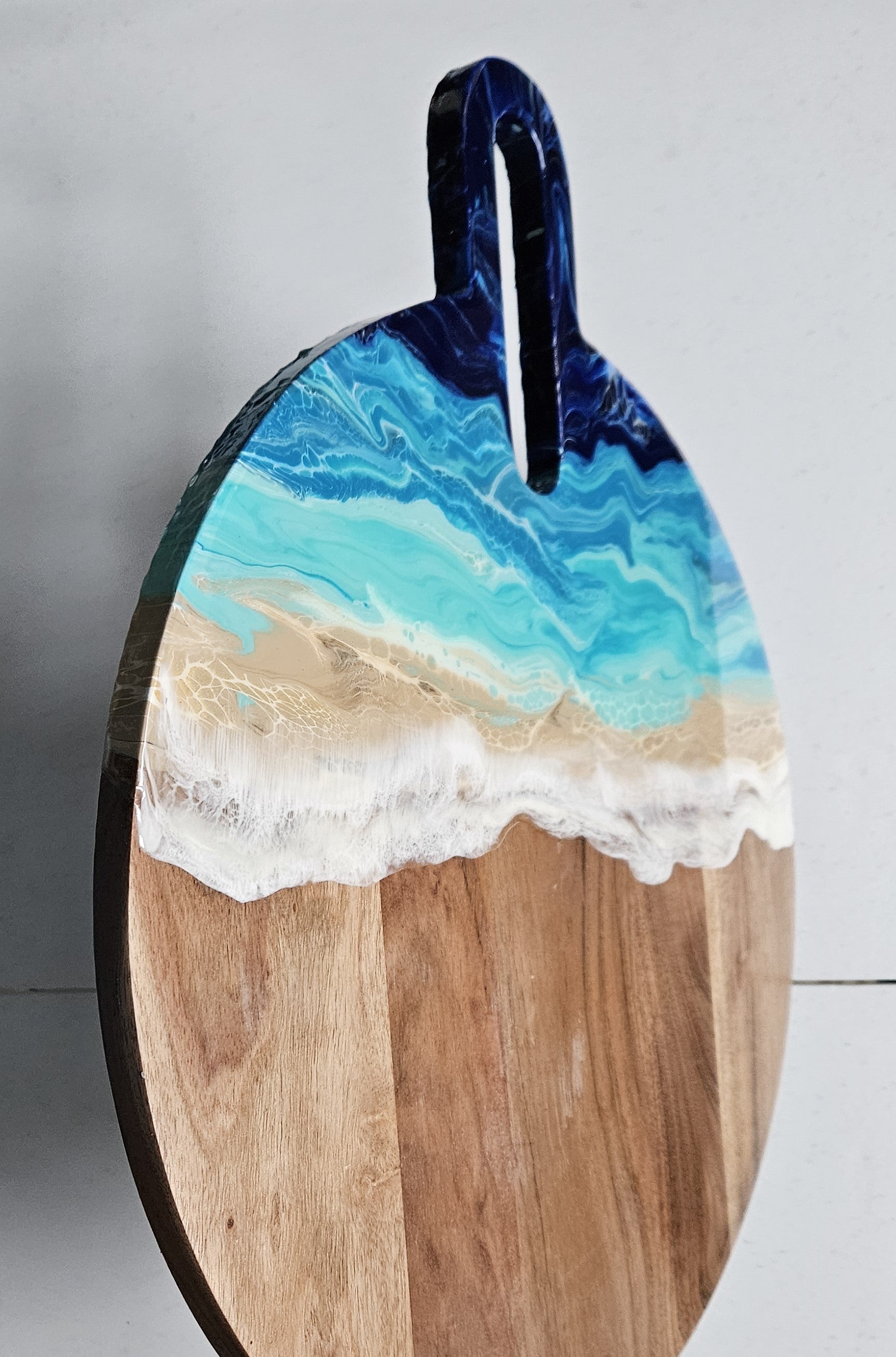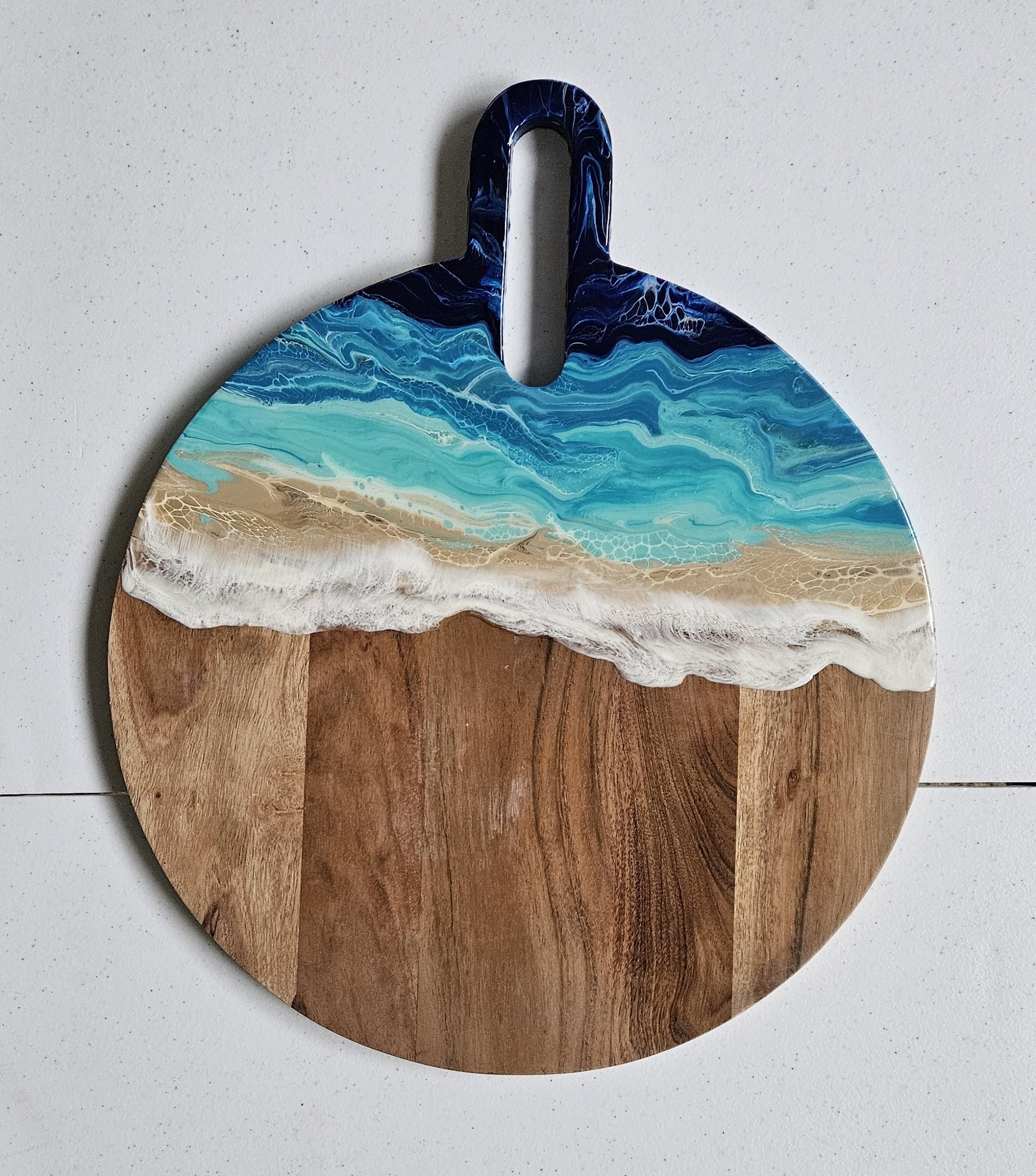 We apply fluid art on the end of the charcuterie and protect the art with a food safe, art grade resin. The resin can take heat up to 120 degrees Fahrenheit. Do not cut on the resin. Hand wash. After washing, you can recondition the wood using a food safe mineral oil. Windex works well to clean the resin.