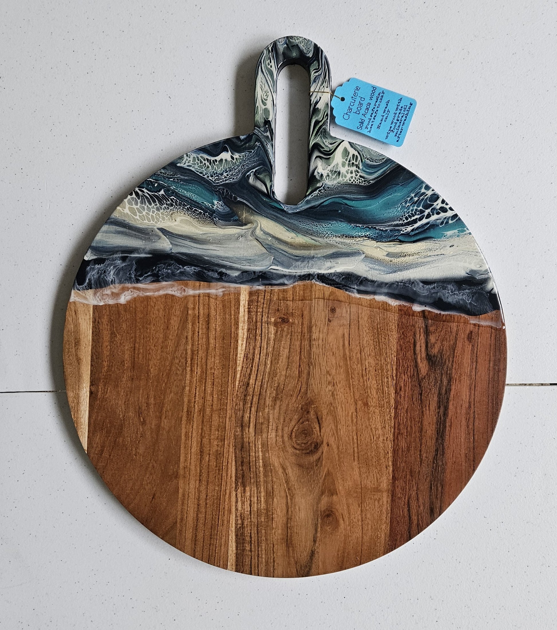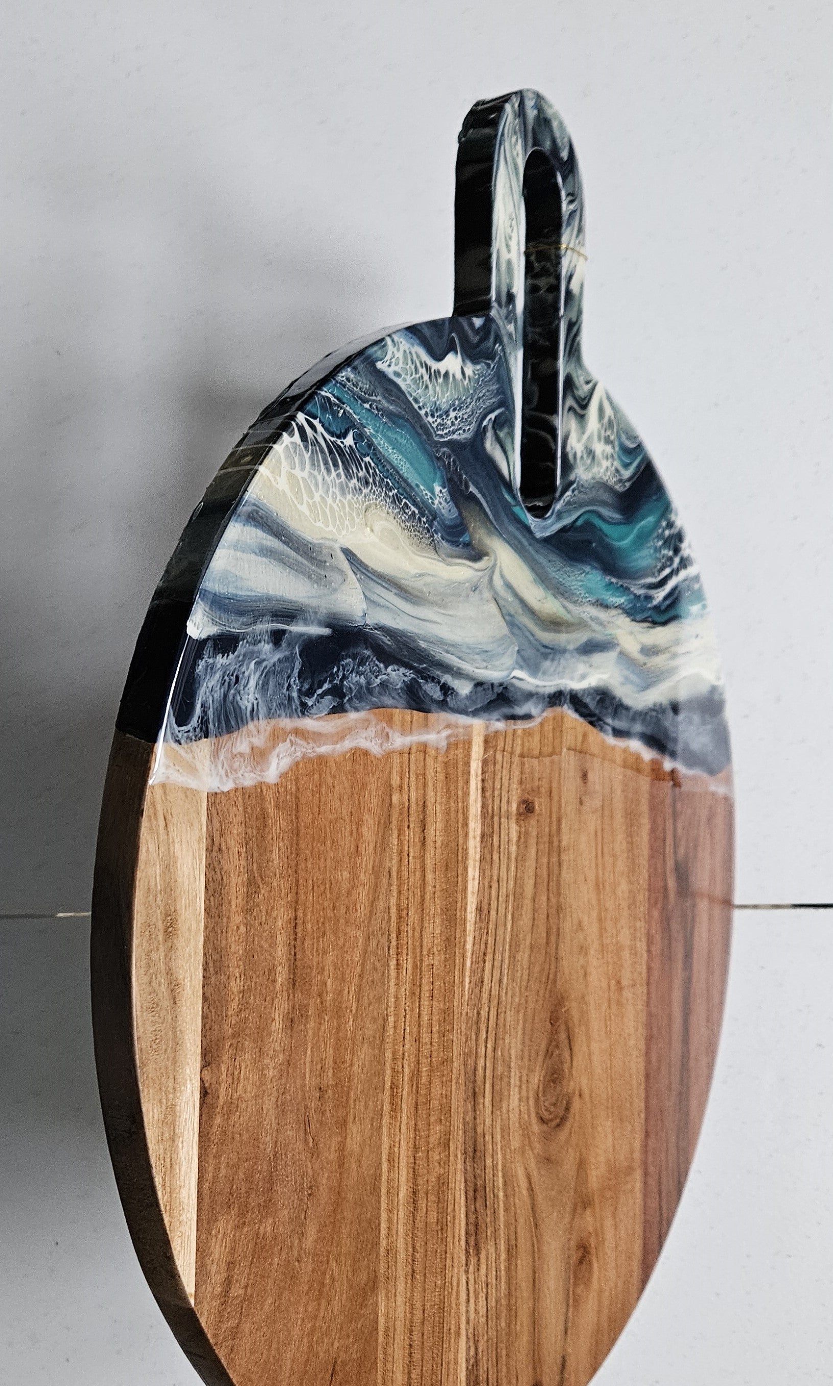 We apply fluid art on the end of the charcuterie and protect the art with a food safe, art grade resin. The resin can take heat up to 120 degrees Fahrenheit. Do not cut on the resin. Hand wash. After washing, you can recondition the wood using a food safe mineral oil. Windex works well to clean the resin.