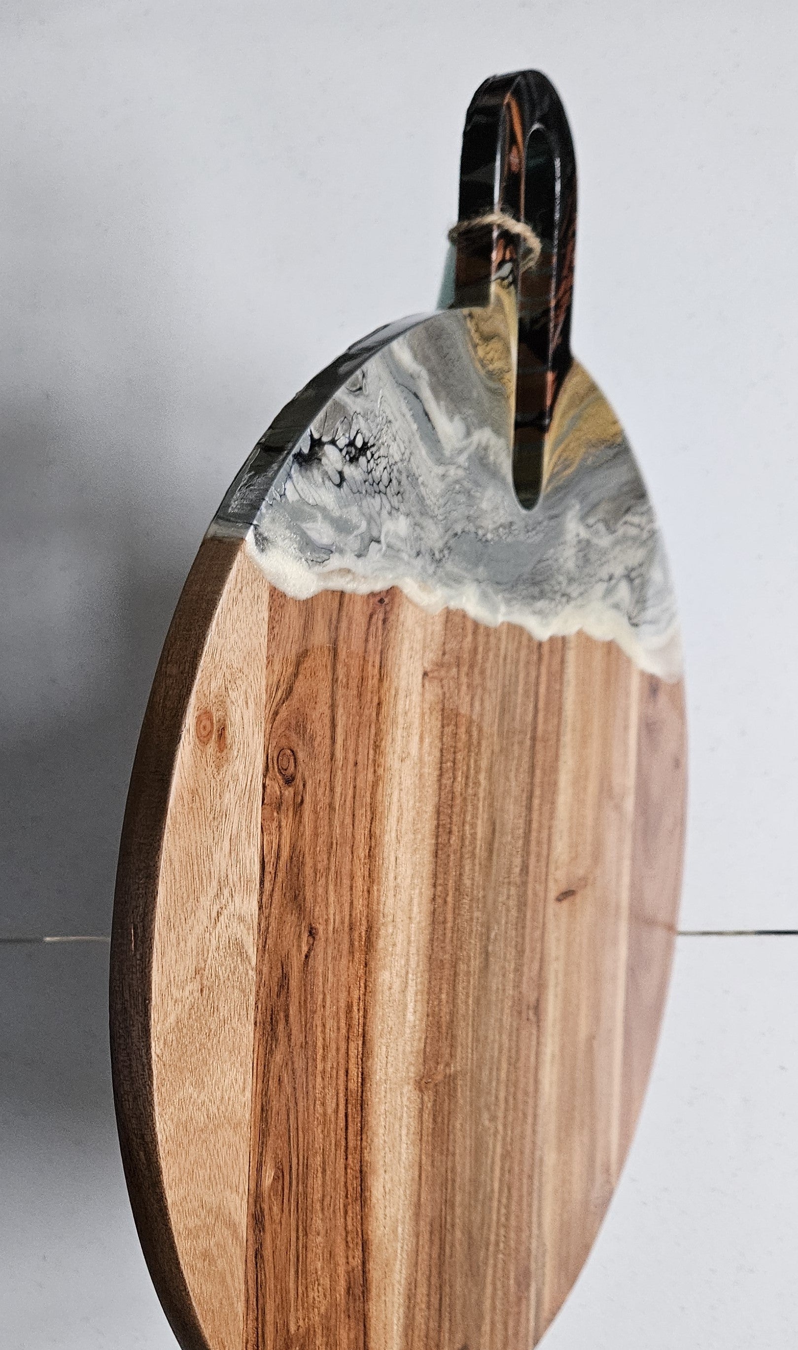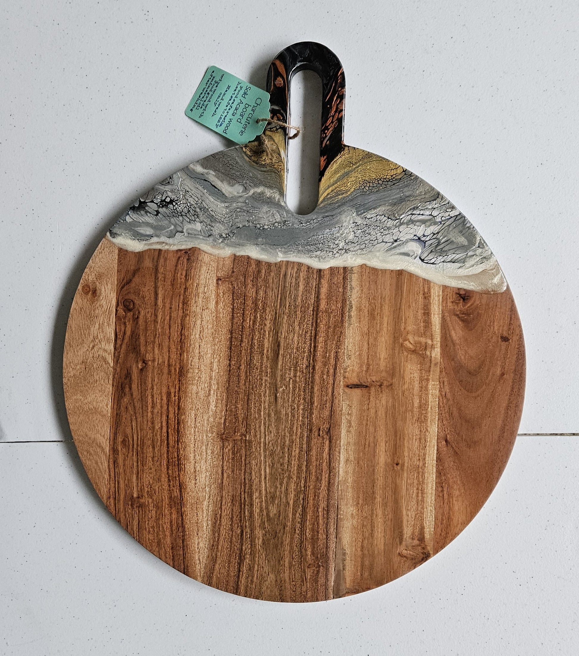 We apply fluid art on the end of the charcuterie and protect the art with a food safe, art grade resin. The resin can take heat up to 120 degrees Fahrenheit. Do not cut on the resin. Hand wash. After washing, you can recondition the wood using a food safe mineral oil. Windex works well to clean the resin.