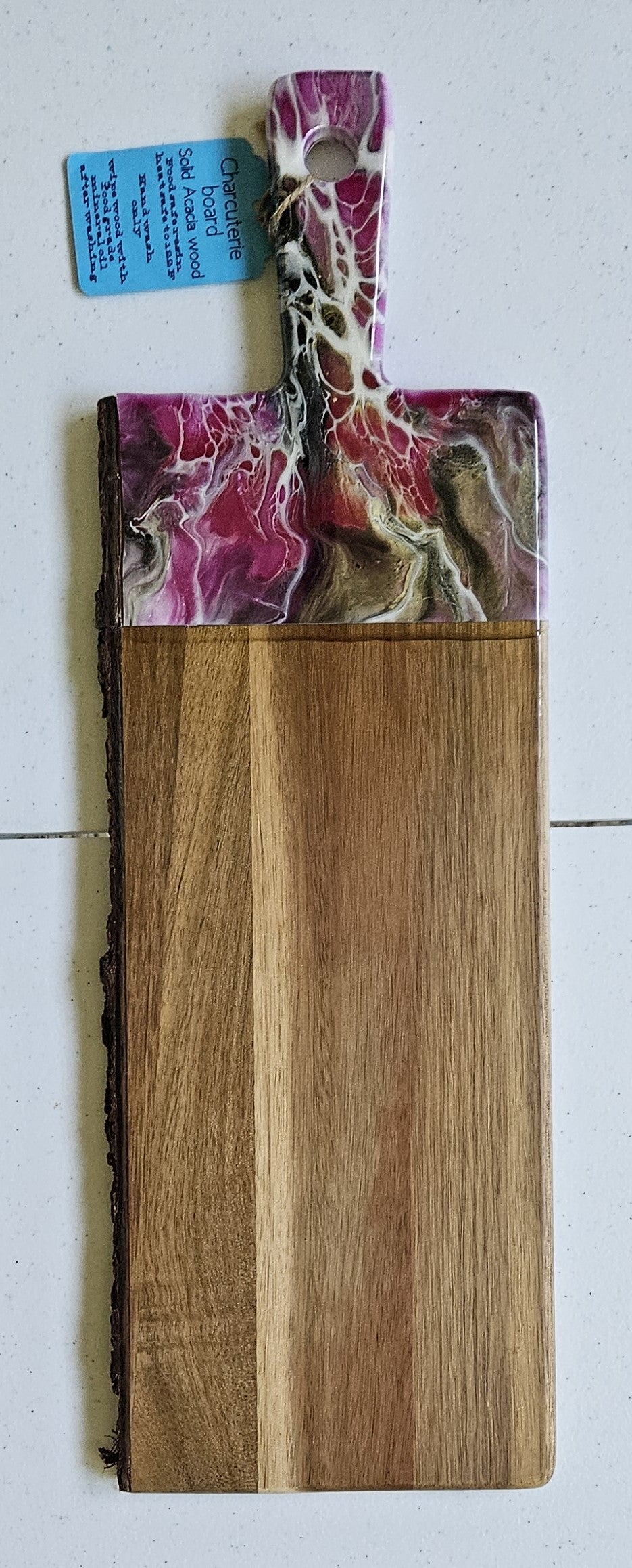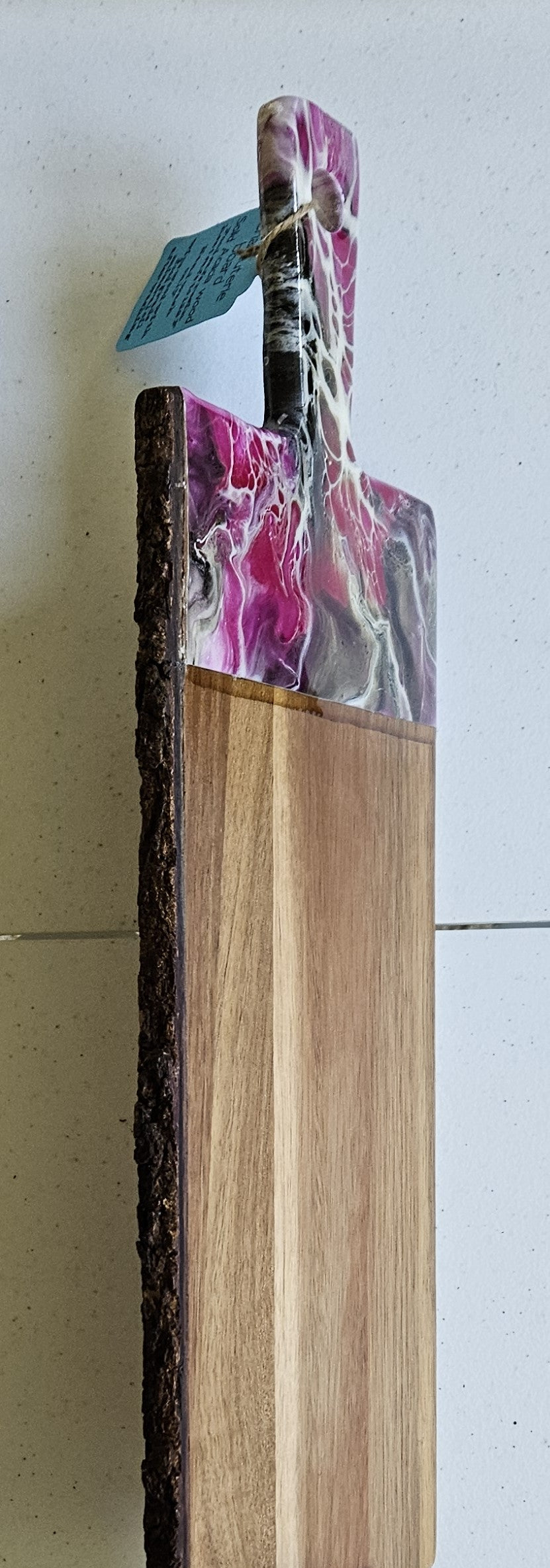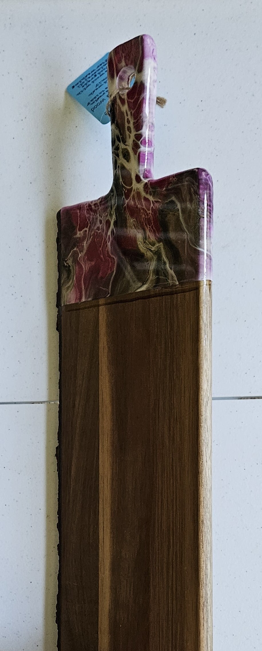 We apply fluid art on the end of the charcuterie and protect the art with a food safe, art grade resin. The resin can take heat up to 120 degrees Fahrenheit. Do not cut on the resin. Hand wash. After washing, you can recondition the wood using a food safe mineral oil. Windex works well to clean the resin.