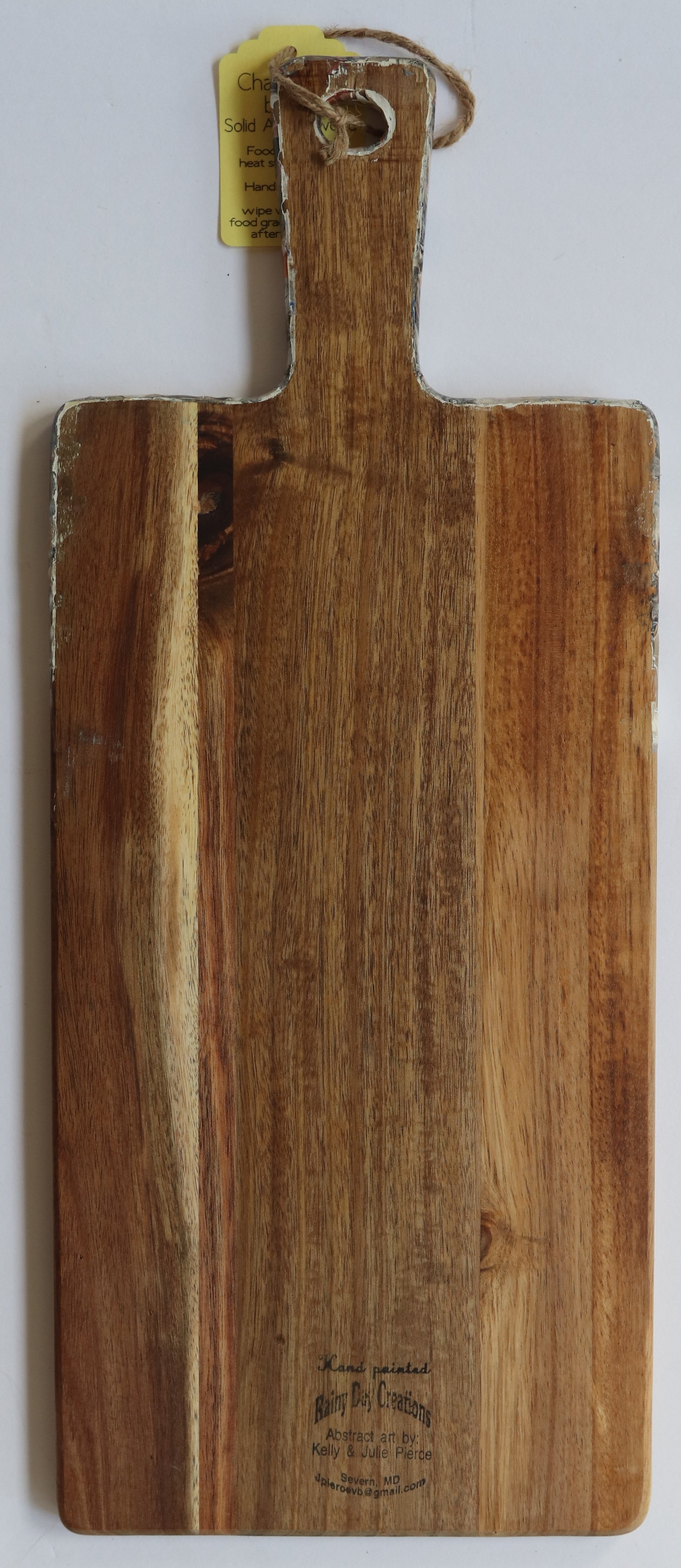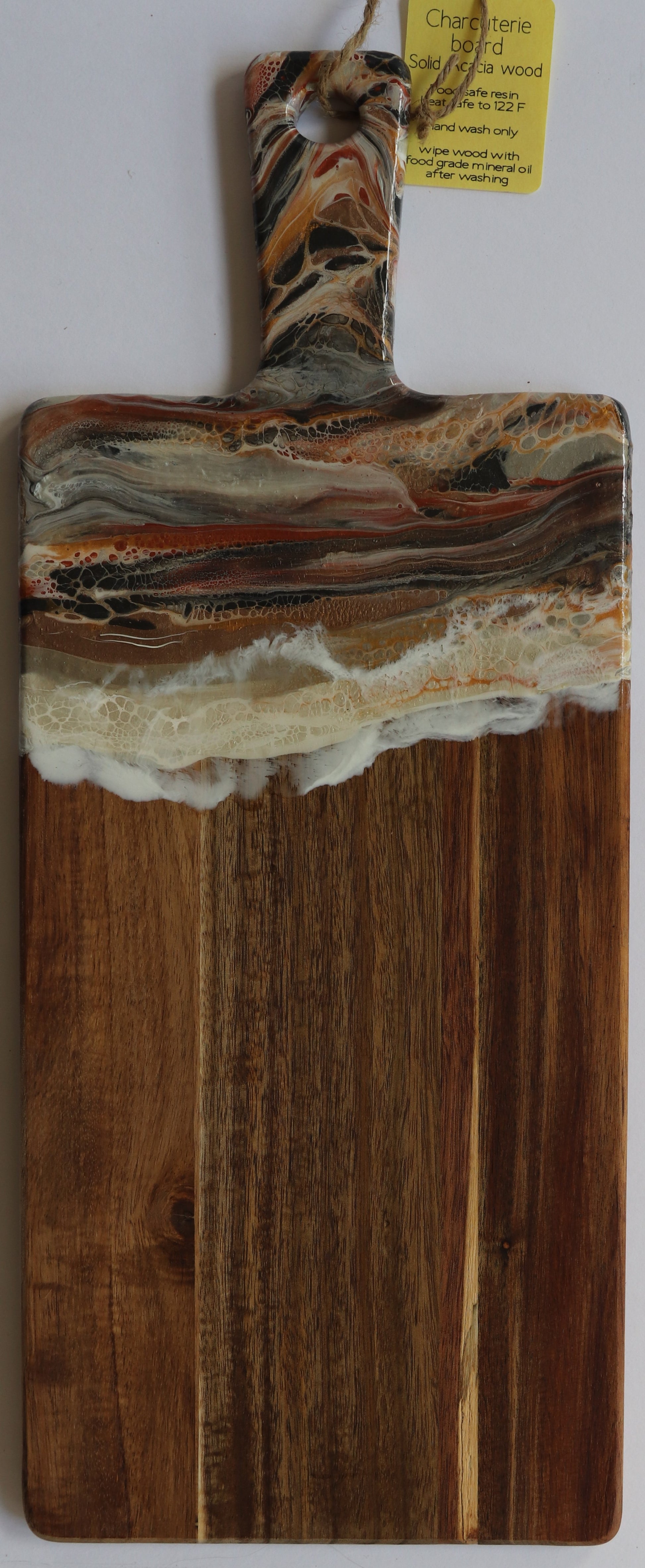 We apply fluid art on the end of the charcuterie and protect the art with a food safe, art grade resin. The resin can take heat up to 120 degrees Fahrenheit. Do not cut on the resin. Hand wash. After washing, you can recondition the wood using a food safe mineral oil. Windex works well to clean the resin.