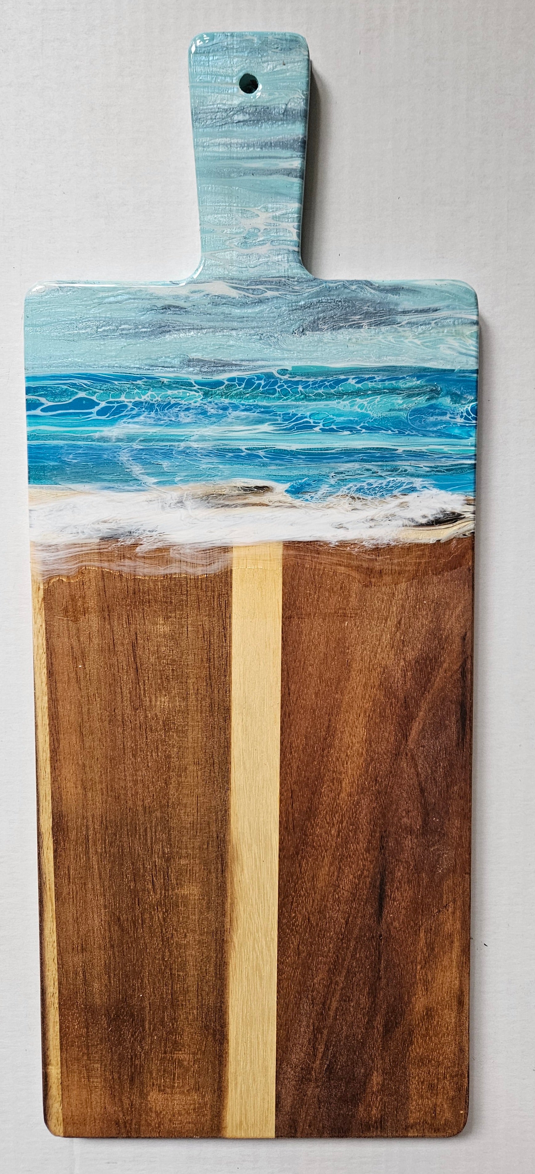 We apply fluid art on the end of the charcuterie and protect the art with a food safe, art grade resin. The resin can take heat up to 120 degrees Fahrenheit. Do not cut on the resin. Hand wash. After washing, you can recondition the wood using a food safe mineral oil. Windex works well to clean the resin.