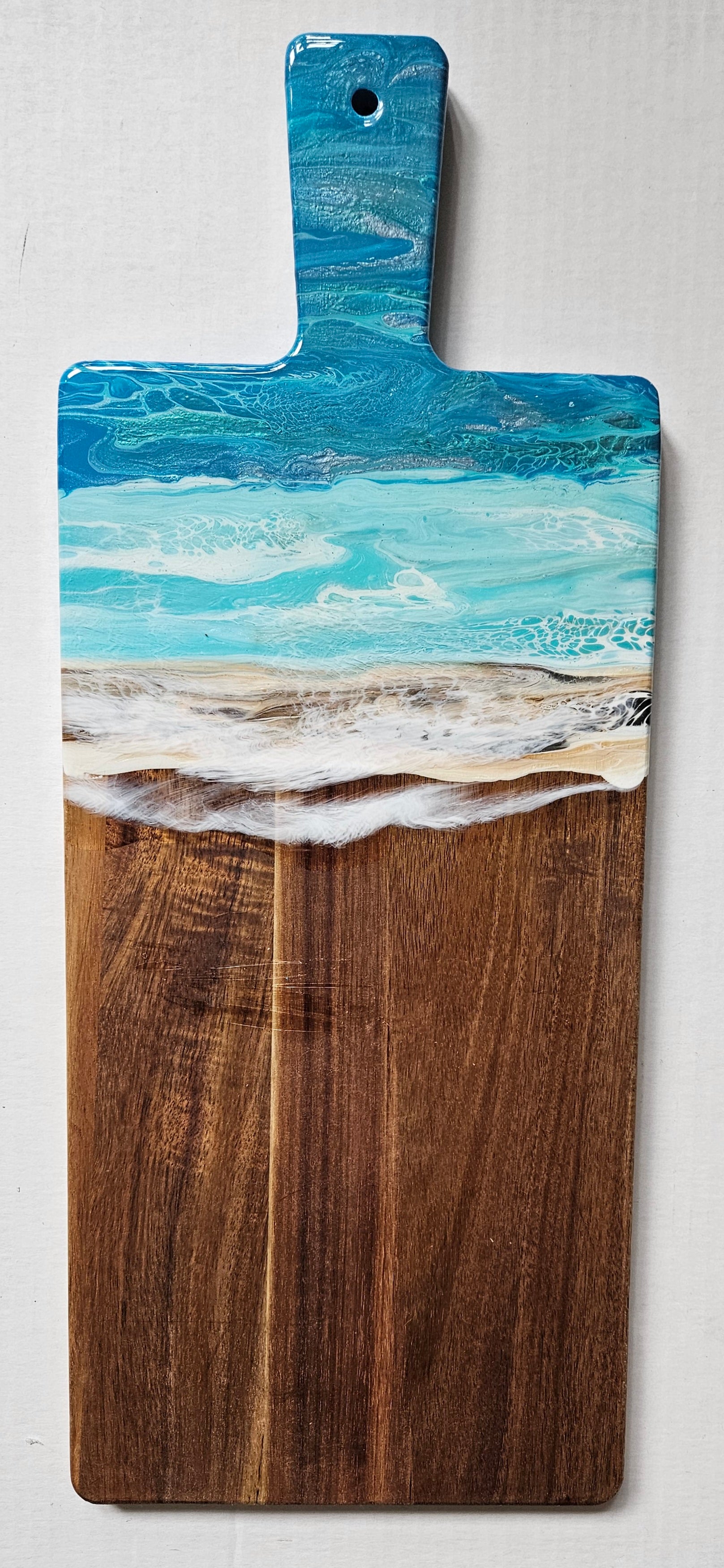 We apply fluid art on the end of the charcuterie and protect the art with a food safe, art grade resin. The resin can take heat up to 120 degrees Fahrenheit. Do not cut on the resin. Hand wash. After washing, you can recondition the wood using a food safe mineral oil. Windex works well to clean the resin.