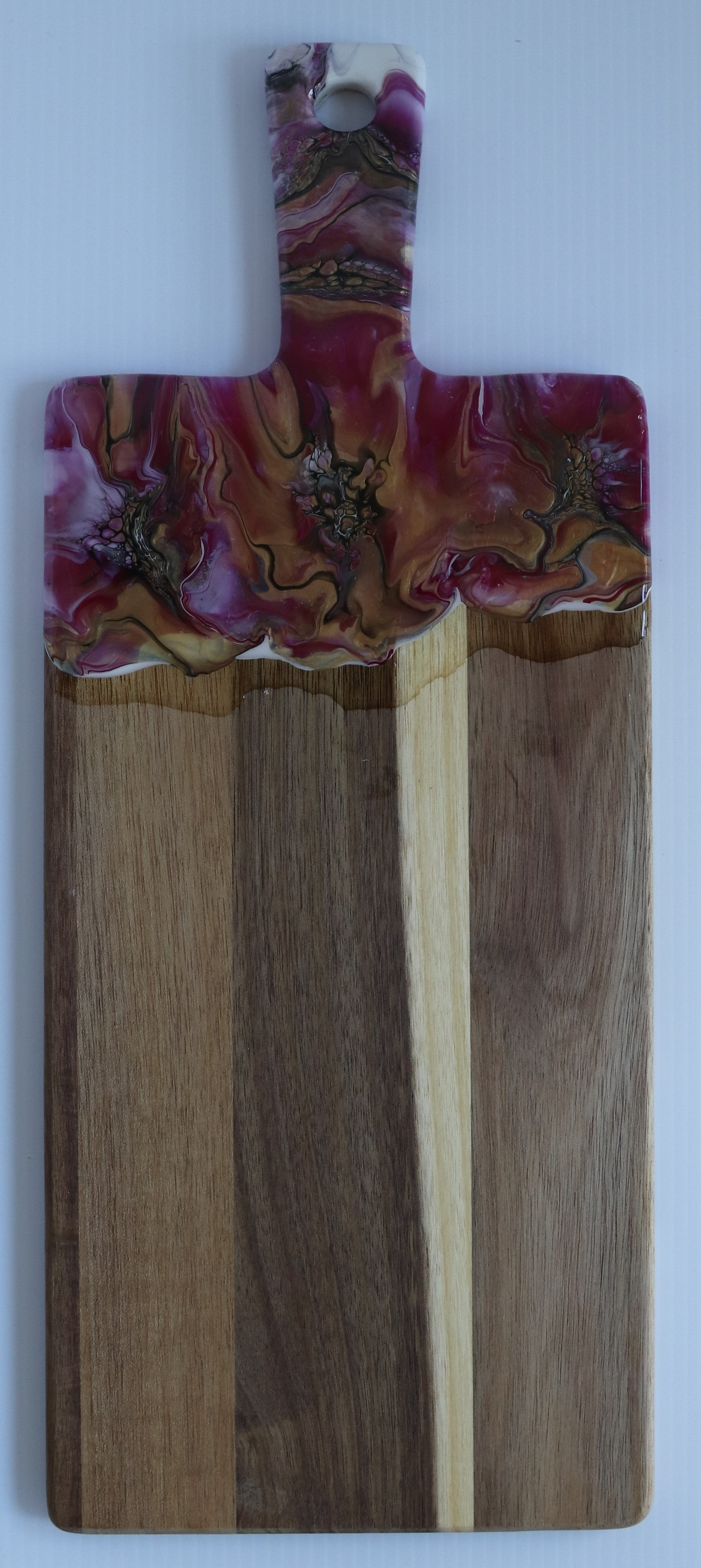 We apply fluid art on the end of the charcuterie and protect the art with a food safe, art grade resin. The resin can take heat up to 120 degrees Fahrenheit. Do not cut on the resin. Hand wash. After washing, you can recondition the wood using a food safe mineral oil. Windex works well to clean the resin.
