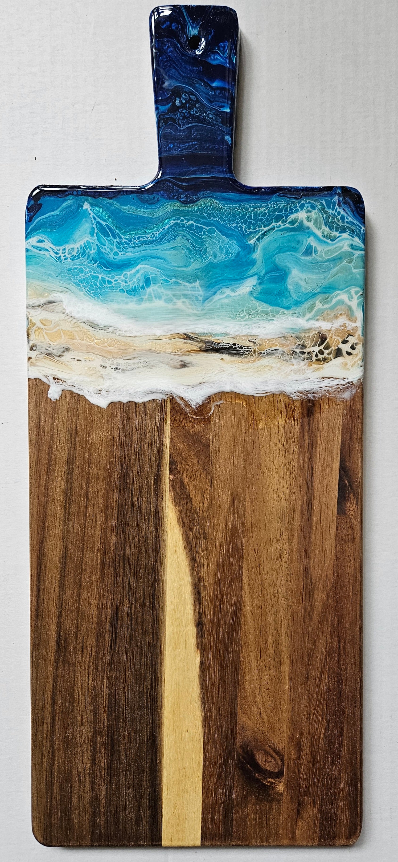 We apply fluid art on the end of the charcuterie and protect the art with a food safe, art grade resin. The resin can take heat up to 120 degrees Fahrenheit. Do not cut on the resin. Hand wash. After washing, you can recondition the wood using a food safe mineral oil. Windex works well to clean the resin.