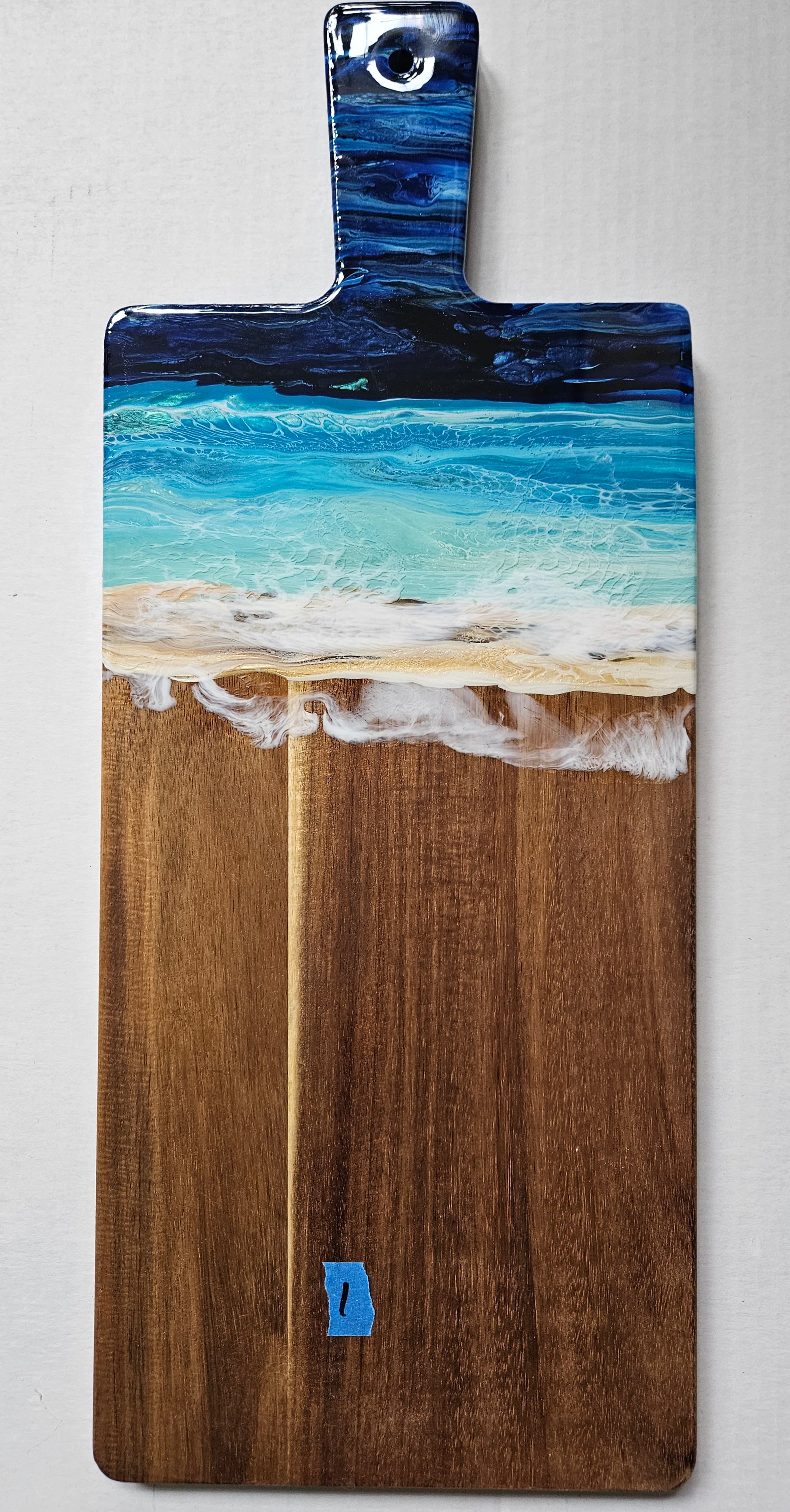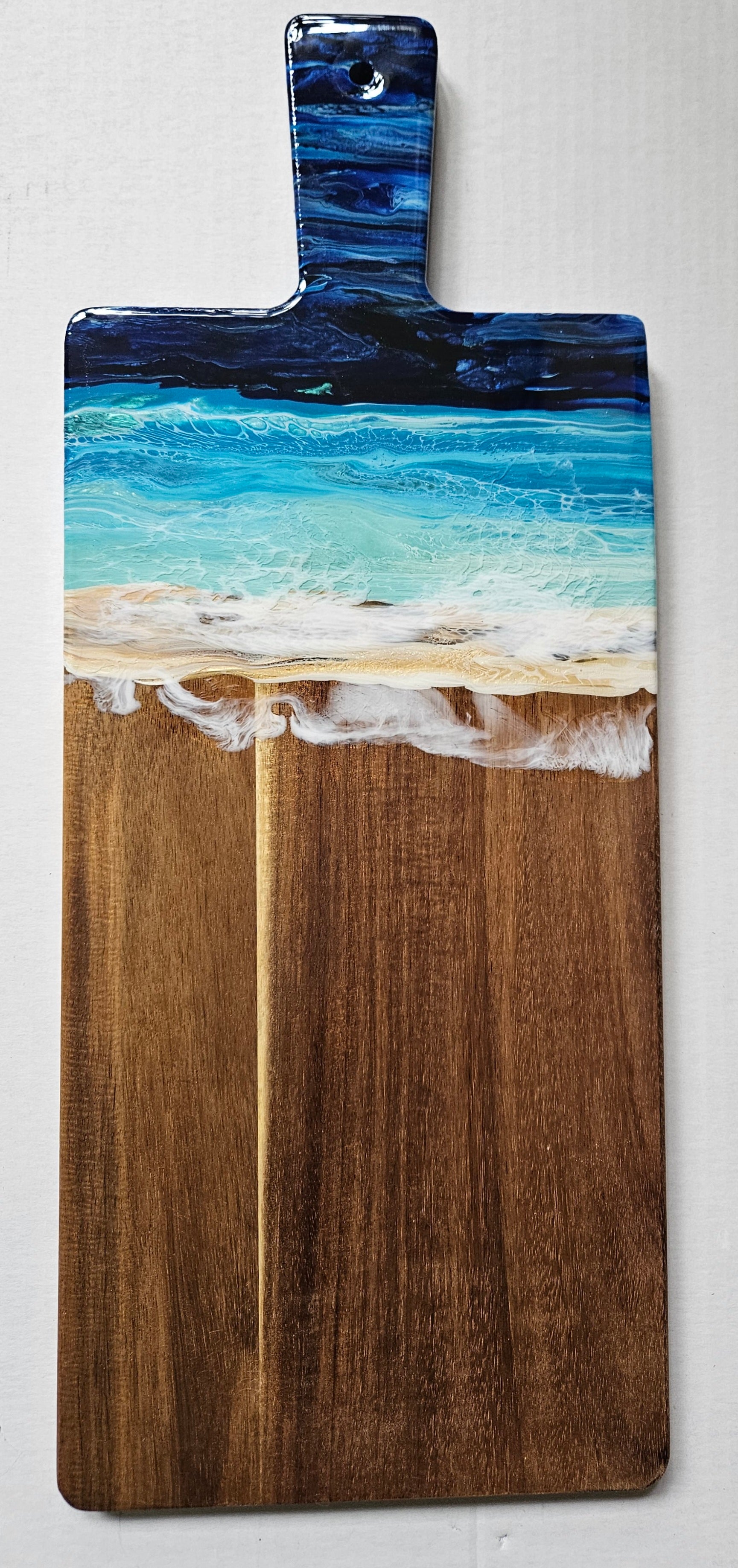 We apply fluid art on the end of the charcuterie and protect the art with a food safe, art grade resin. The resin can take heat up to 120 degrees Fahrenheit. Do not cut on the resin. Hand wash. After washing, you can recondition the wood using a food safe mineral oil. Windex works well to clean the resin.