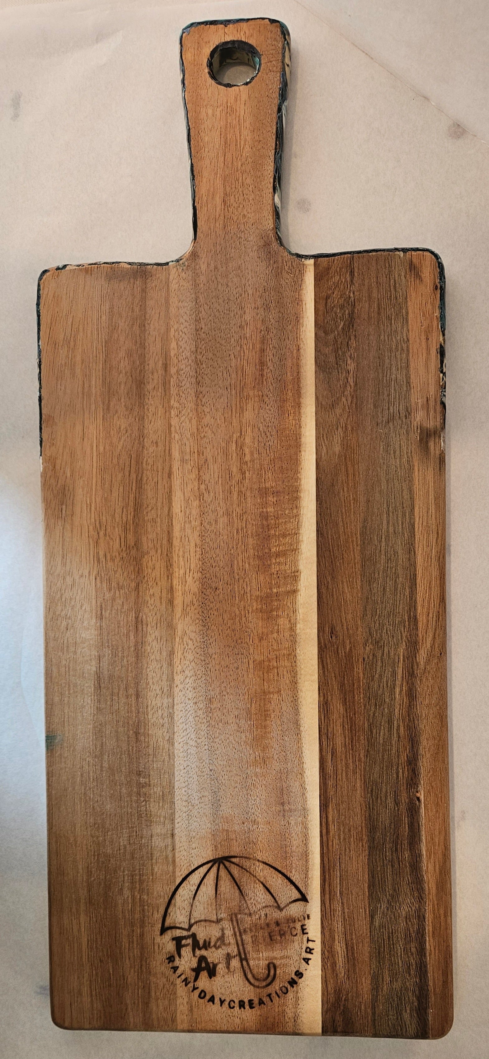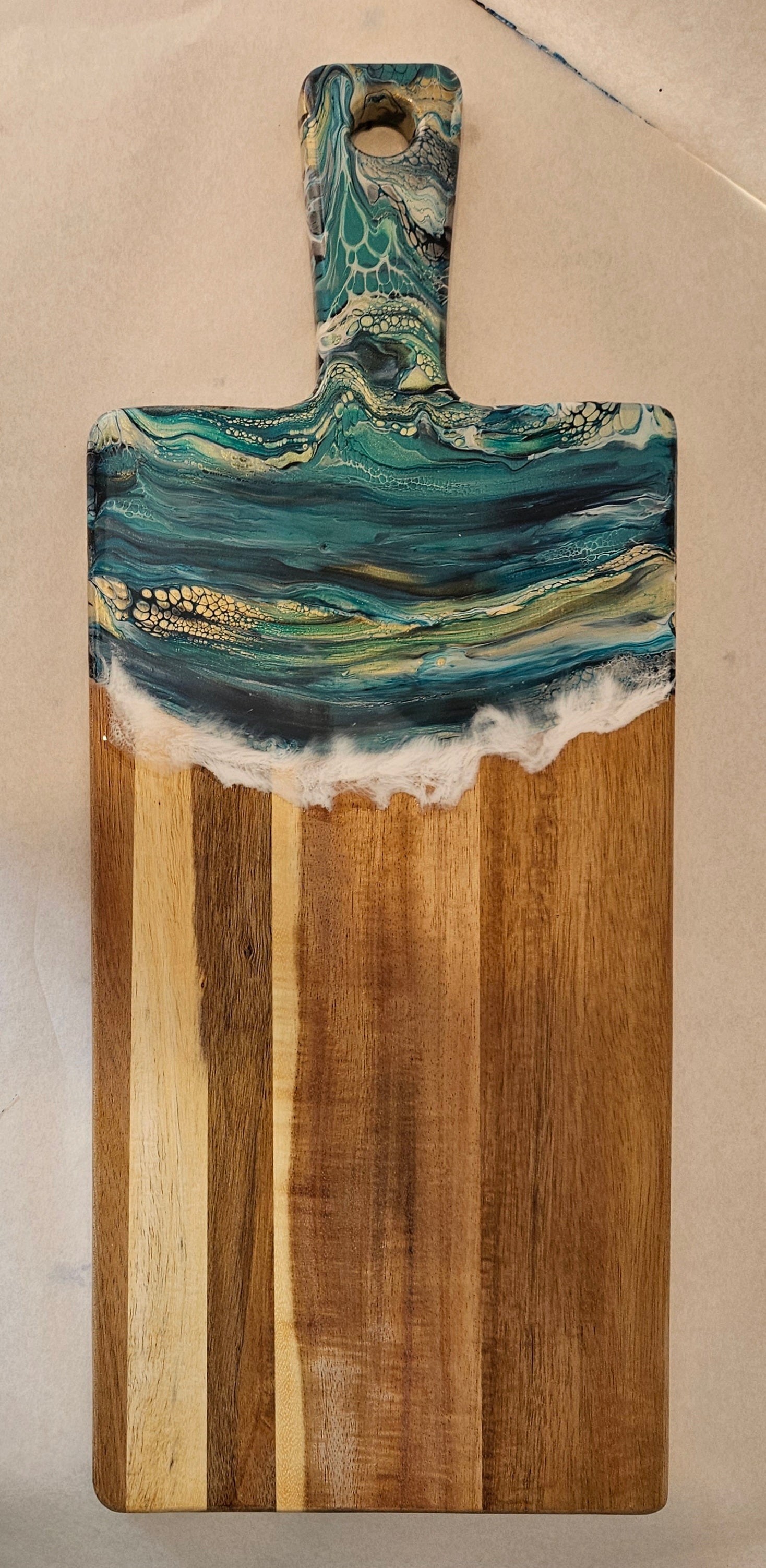 We apply fluid art on the end of the charcuterie and protect the art with a food safe, art grade resin. The resin can take heat up to 120 degrees Fahrenheit. Do not cut on the resin. Hand wash. After washing, you can recondition the wood using a food safe mineral oil. Windex works well to clean the resin.