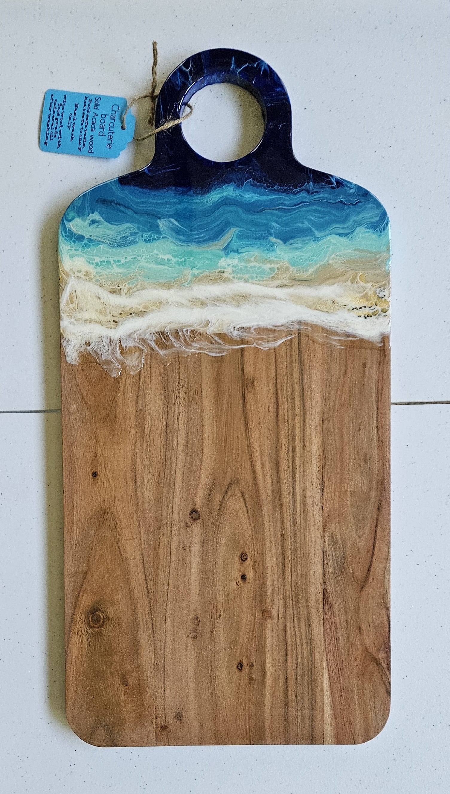 We apply fluid art on the end of the charcuterie and protect the art with a food safe, art grade resin. The resin can take heat up to 120 degrees Fahrenheit. Do not cut on the resin. Hand wash. After washing, you can recondition the wood using a food safe mineral oil. Windex works well to clean the resin.