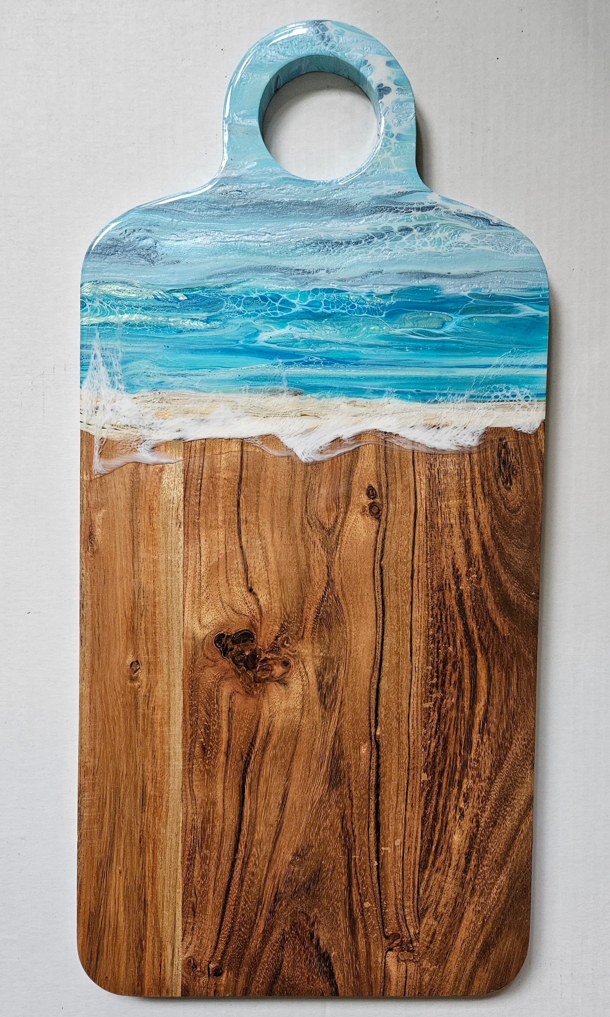 We apply fluid art on the end of the charcuterie and protect the art with a food safe, art grade resin. The resin can take heat up to 120 degrees Fahrenheit. Do not cut on the resin. Hand wash. After washing, you can recondition the wood using a food safe mineral oil. Windex works well to clean the resin.