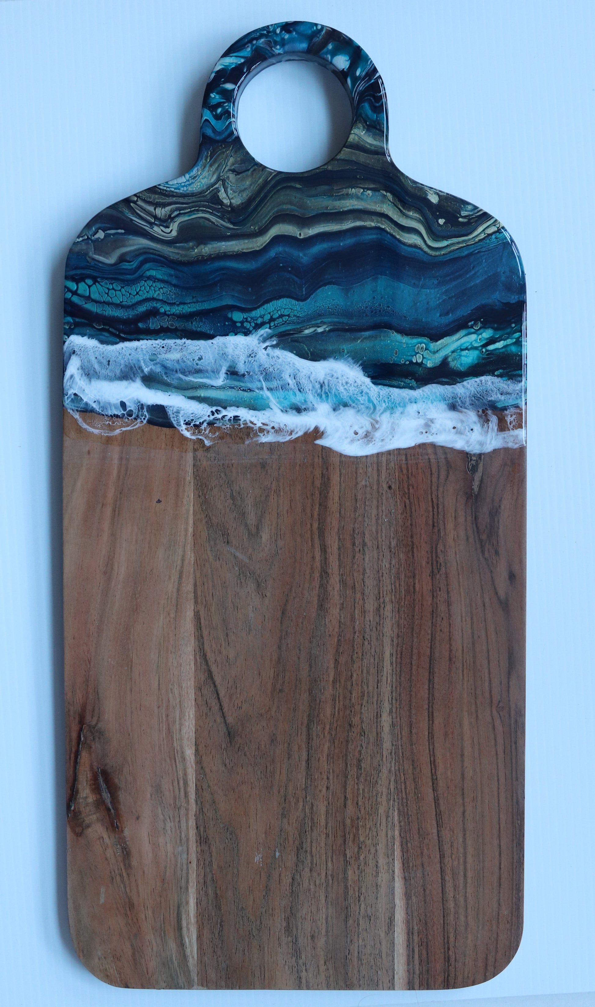 We apply fluid art on the end of the charcuterie and protect the art with a food safe, art grade resin. The resin can take heat up to 120 degrees Fahrenheit. Do not cut on the resin. Hand wash. After washing, you can recondition the wood using a food safe mineral oil. Windex works well to clean the resin.