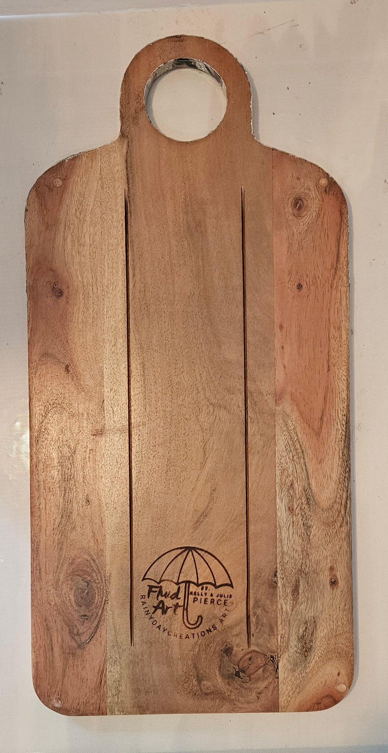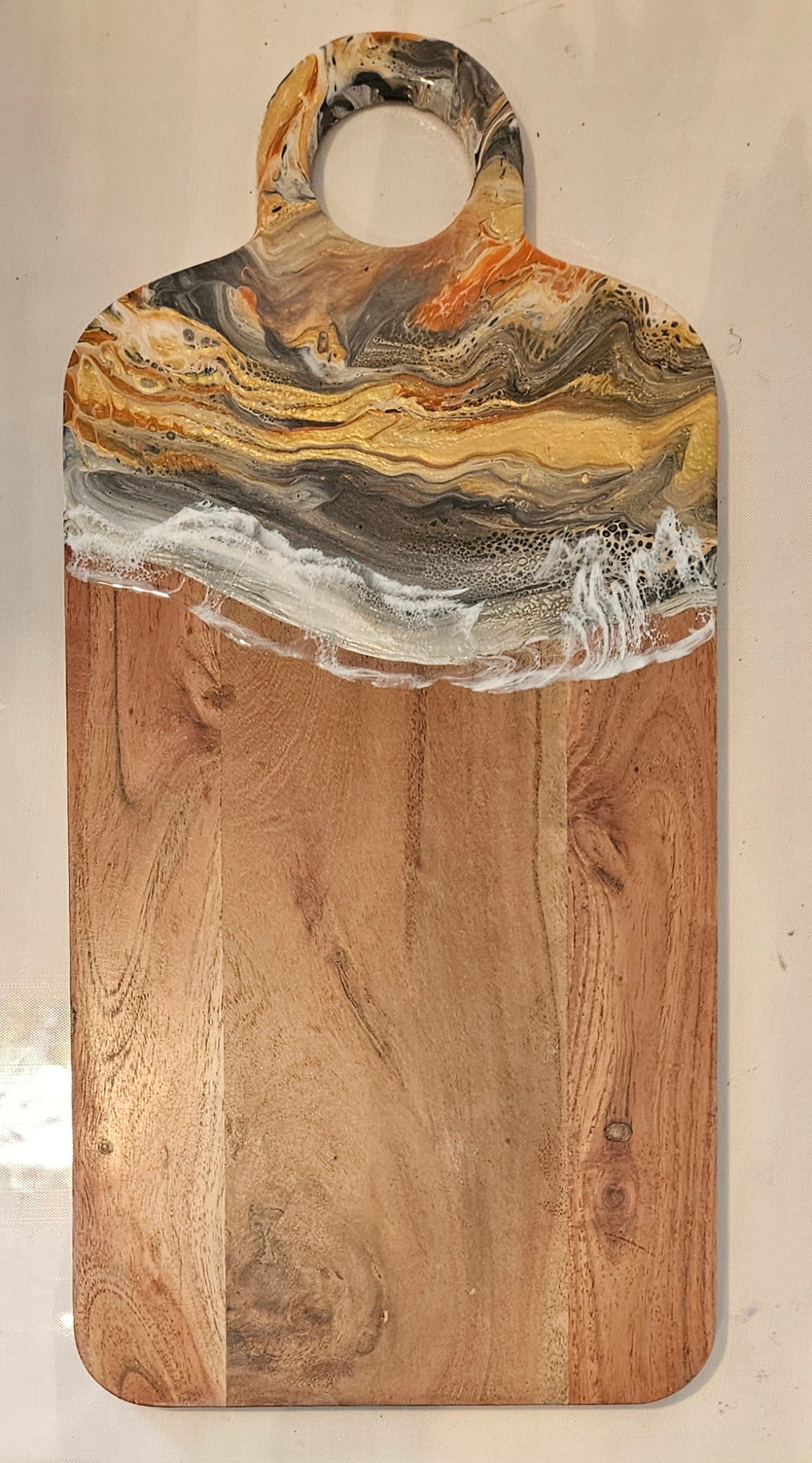 We apply fluid art on the end of the charcuterie and protect the art with a food safe, art grade resin. The resin can take heat up to 120 degrees Fahrenheit. Do not cut on the resin. Hand wash. After washing, you can recondition the wood using a food safe mineral oil. Windex works well to clean the resin.
