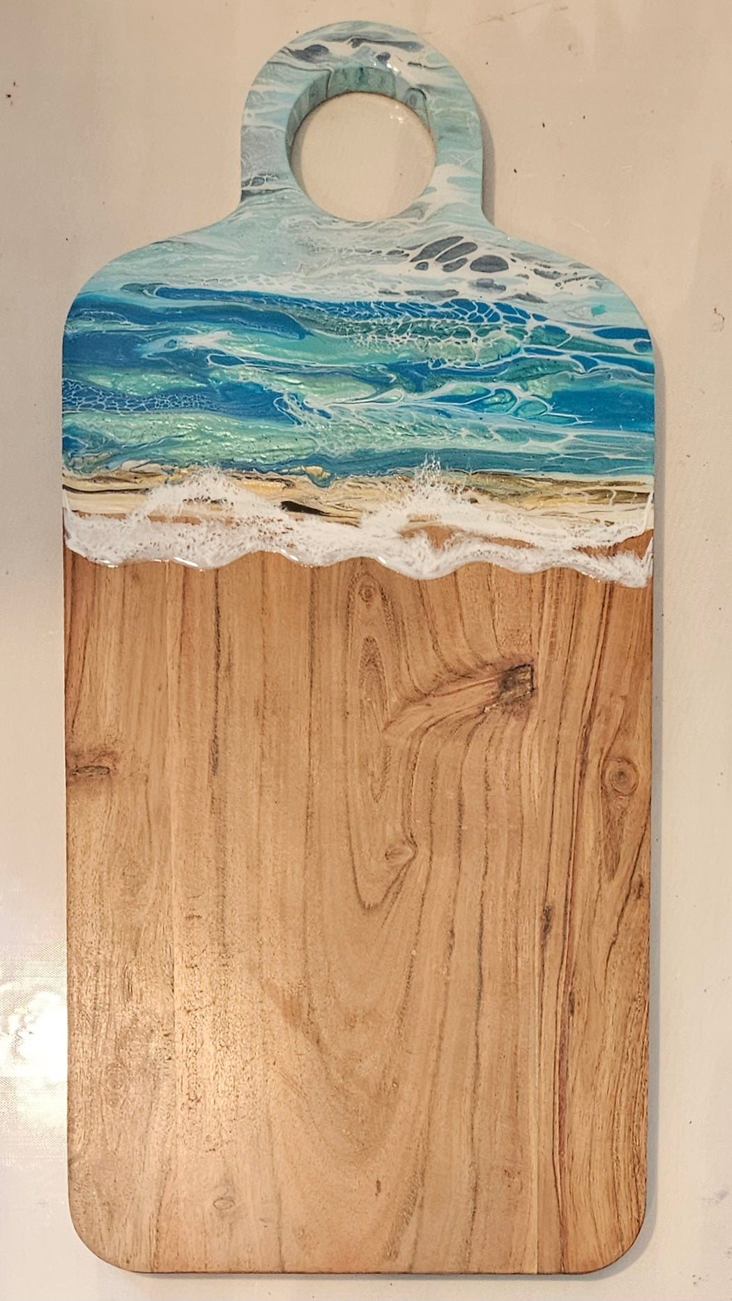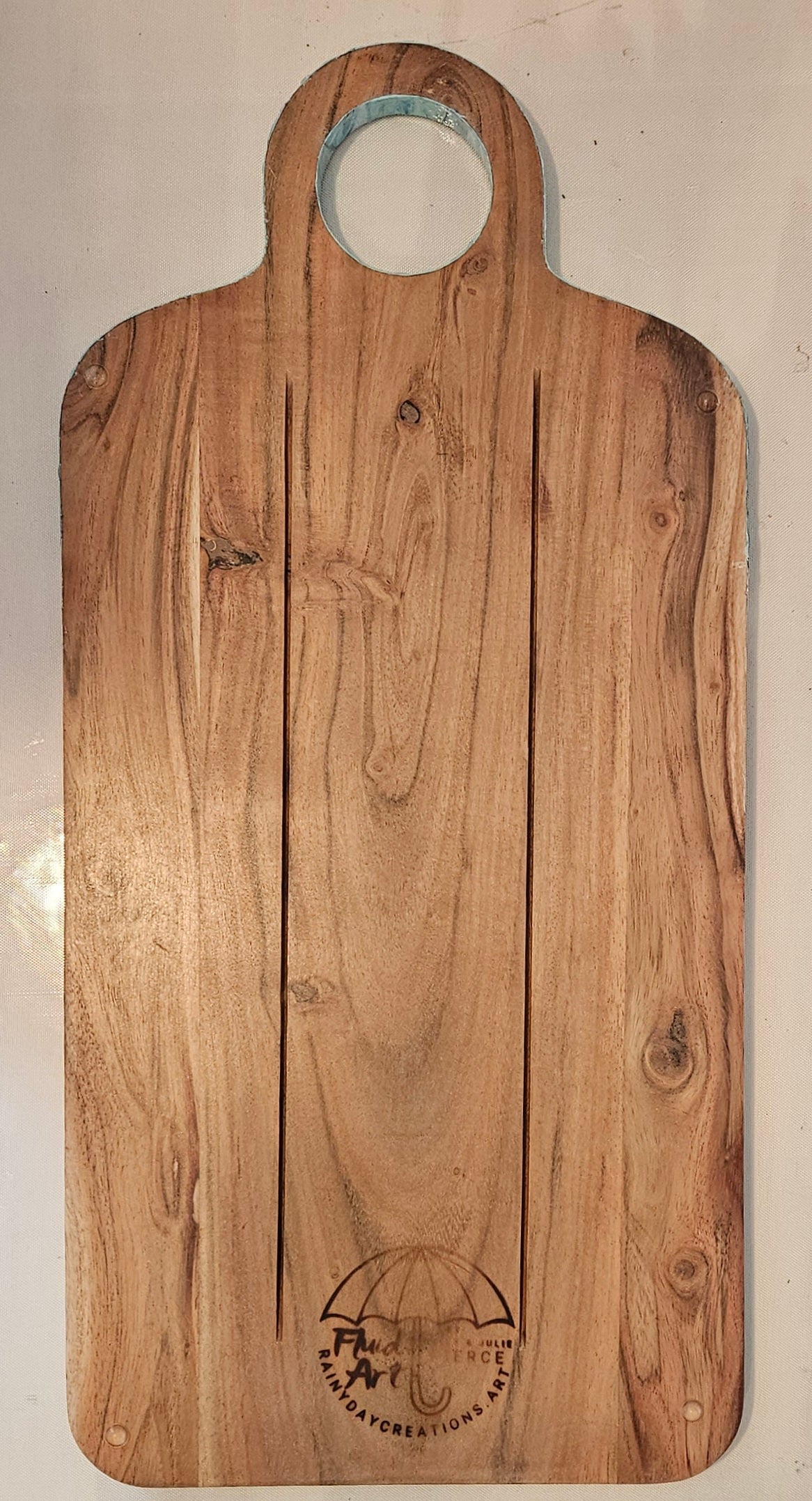 We apply fluid art on the end of the charcuterie and protect the art with a food safe, art grade resin. The resin can take heat up to 120 degrees Fahrenheit. Do not cut on the resin. Hand wash. After washing, you can recondition the wood using a food safe mineral oil. Windex works well to clean the resin.
