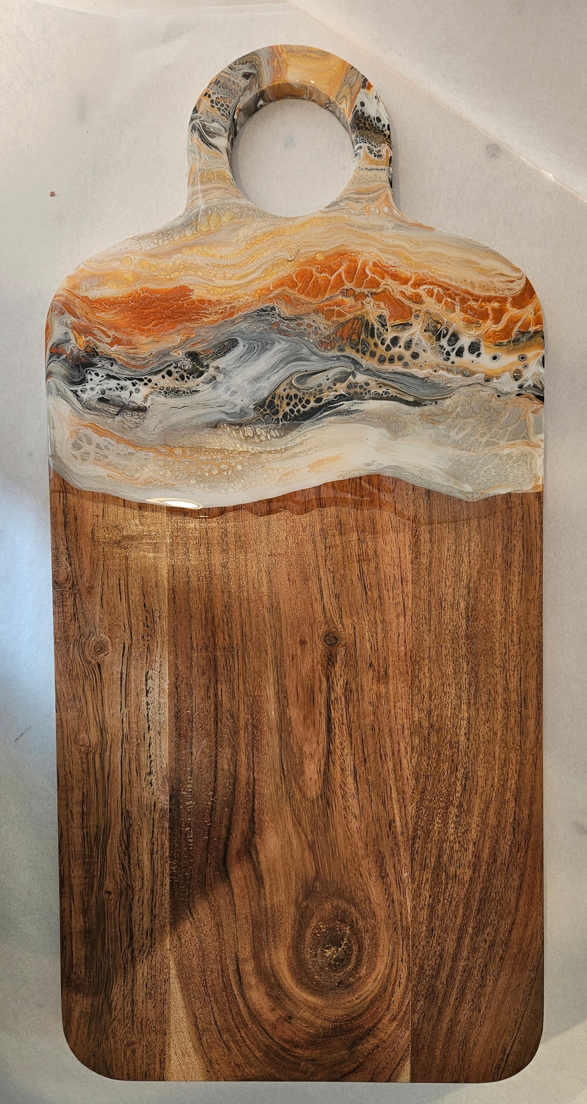We apply fluid art on the end of the charcuterie and protect the art with a food safe, art grade resin. The resin can take heat up to 120 degrees Fahrenheit. Do not cut on the resin. Hand wash. After washing, you can recondition the wood using a food safe mineral oil. Windex works well to clean the resin.