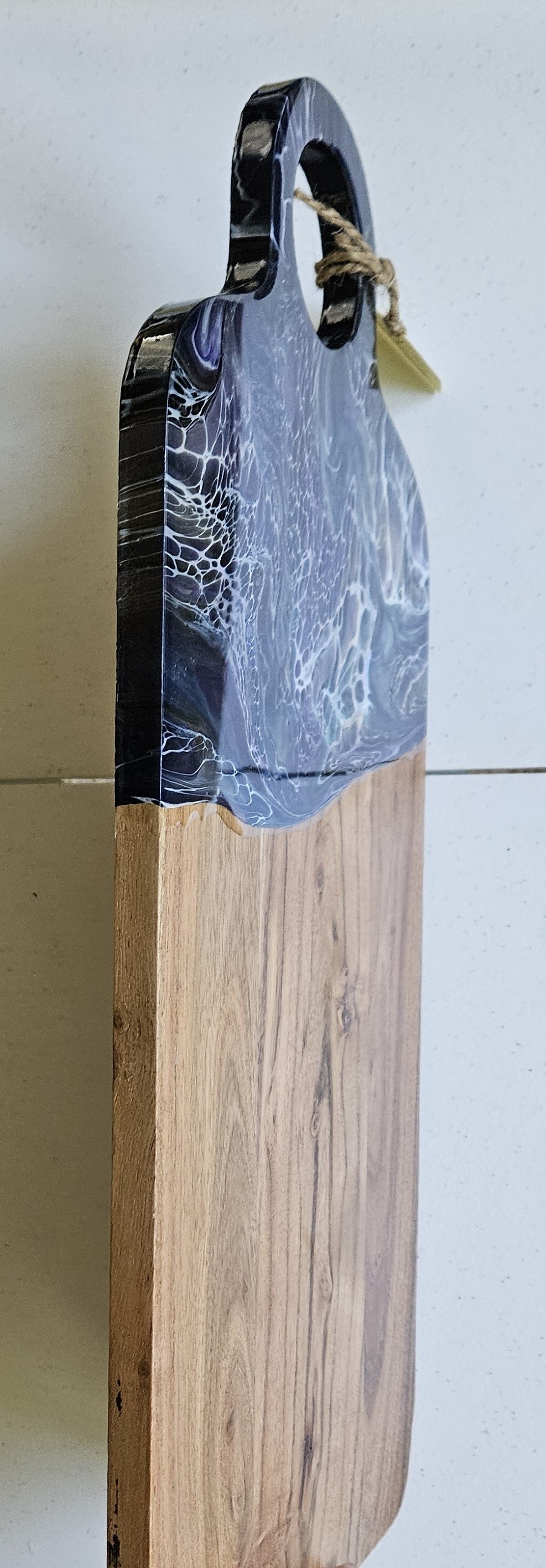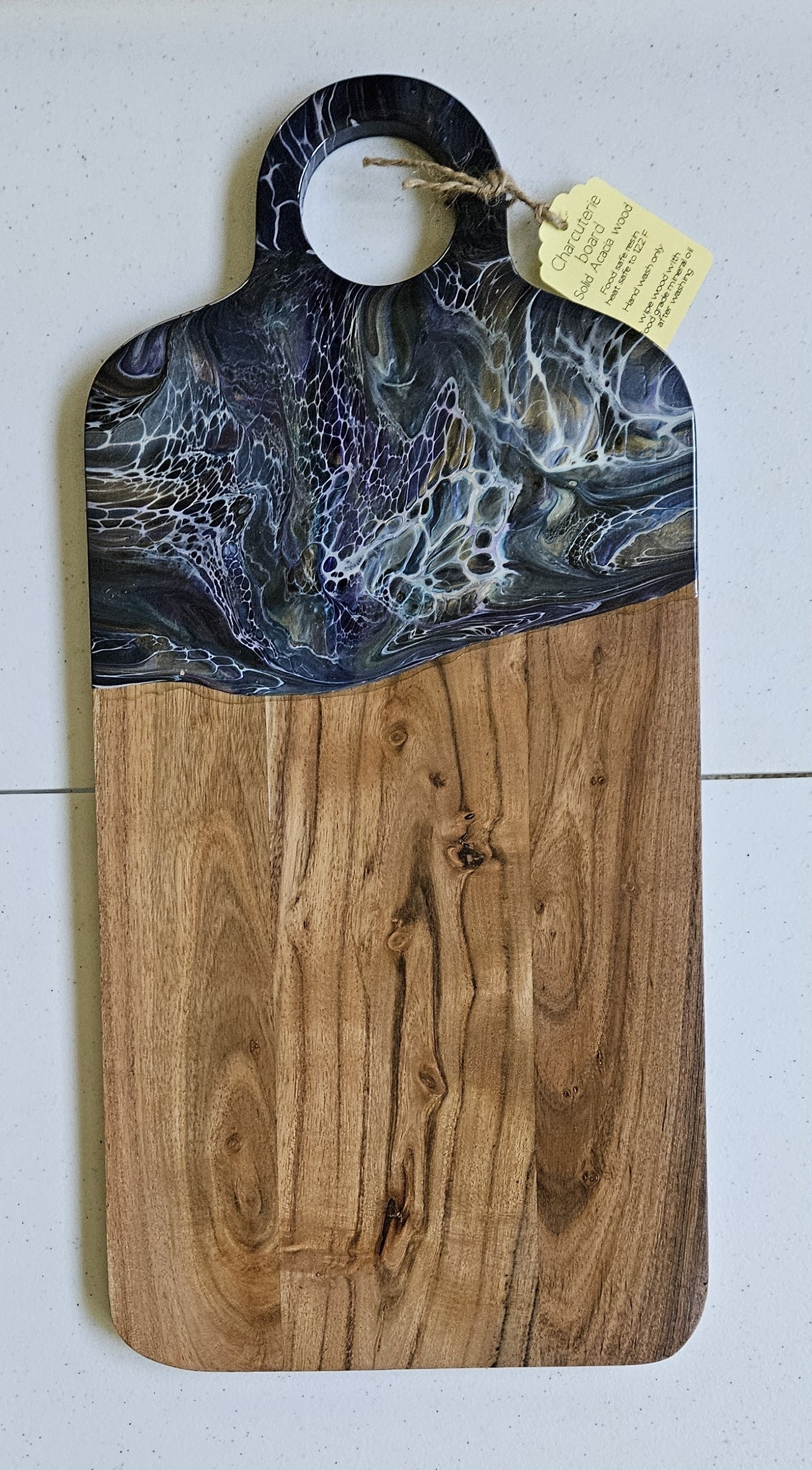 We apply fluid art on the end of the charcuterie and protect the art with a food safe, art grade resin. The resin can take heat up to 120 degrees Fahrenheit. Do not cut on the resin. Hand wash. After washing, you can recondition the wood using a food safe mineral oil. Windex works well to clean the resin.