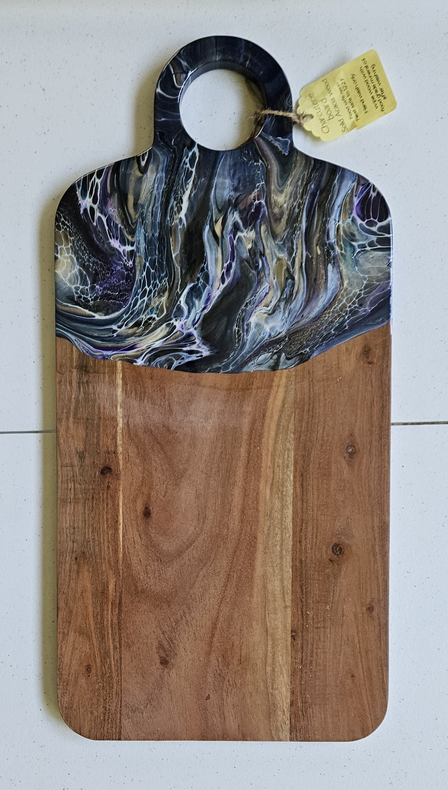 We apply fluid art on the end of the charcuterie and protect the art with a food safe, art grade resin. The resin can take heat up to 120 degrees Fahrenheit. Do not cut on the resin. Hand wash. After washing, you can recondition the wood using a food safe mineral oil. Windex works well to clean the resin.