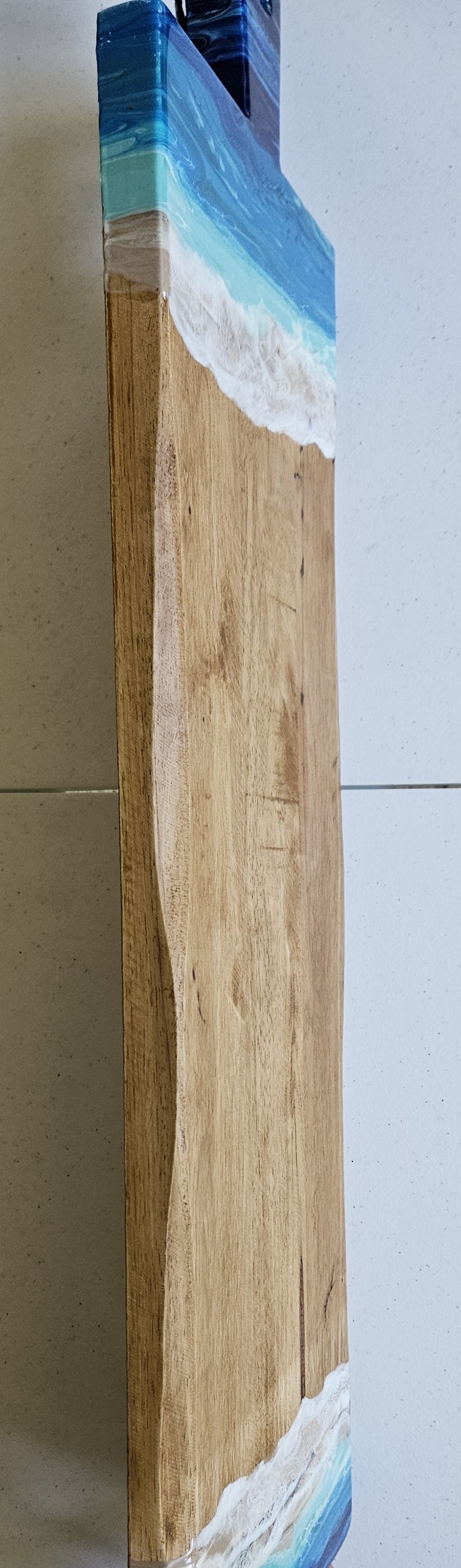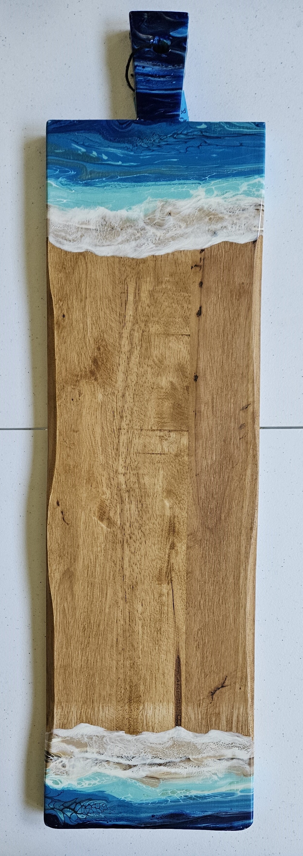 We apply fluid art on the end of the charcuterie and protect the art with a food safe, art grade resin. The resin can take heat up to 120 degrees Fahrenheit. Do not cut on the resin. Hand wash. After washing, you can recondition the wood using a food safe mineral oil. Windex works well to clean the resin.