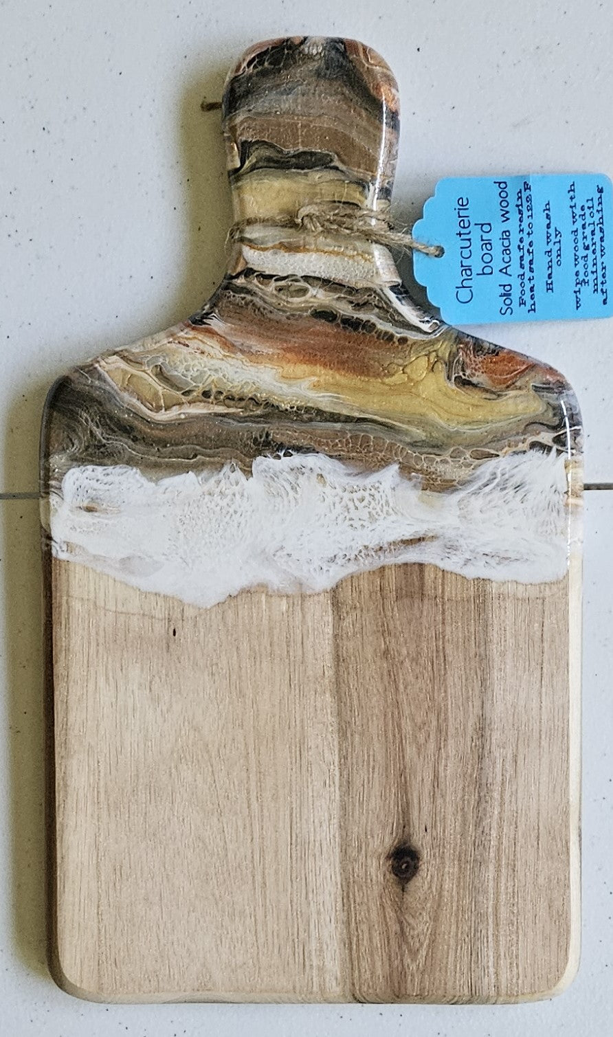 We apply fluid art on the end of the charcuterie and protect the art with a food safe, art grade resin. The resin can take heat up to 120 degrees Fahrenheit. Do not cut on the resin. Hand wash. After washing, you can recondition the wood using a food safe mineral oil. Windex works well to clean the resin.