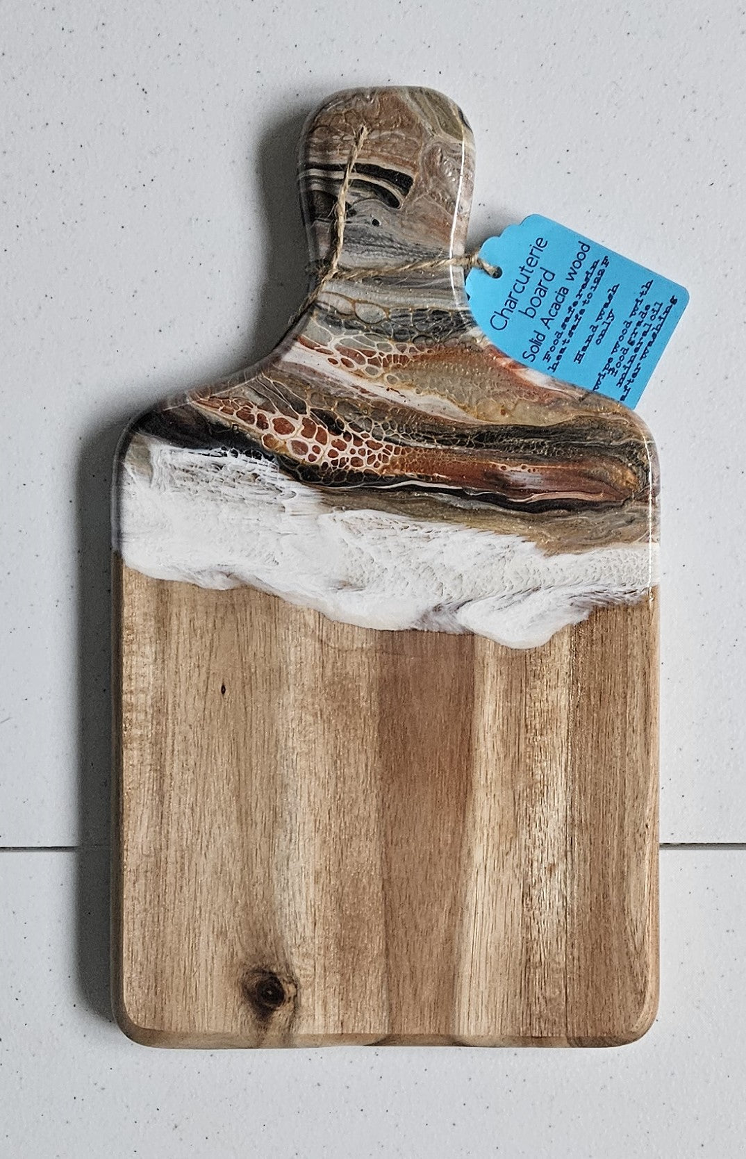 We apply fluid art on the end of the charcuterie and protect the art with a food safe, art grade resin. The resin can take heat up to 120 degrees Fahrenheit. Do not cut on the resin. Hand wash. After washing, you can recondition the wood using a food safe mineral oil. Windex works well to clean the resin.