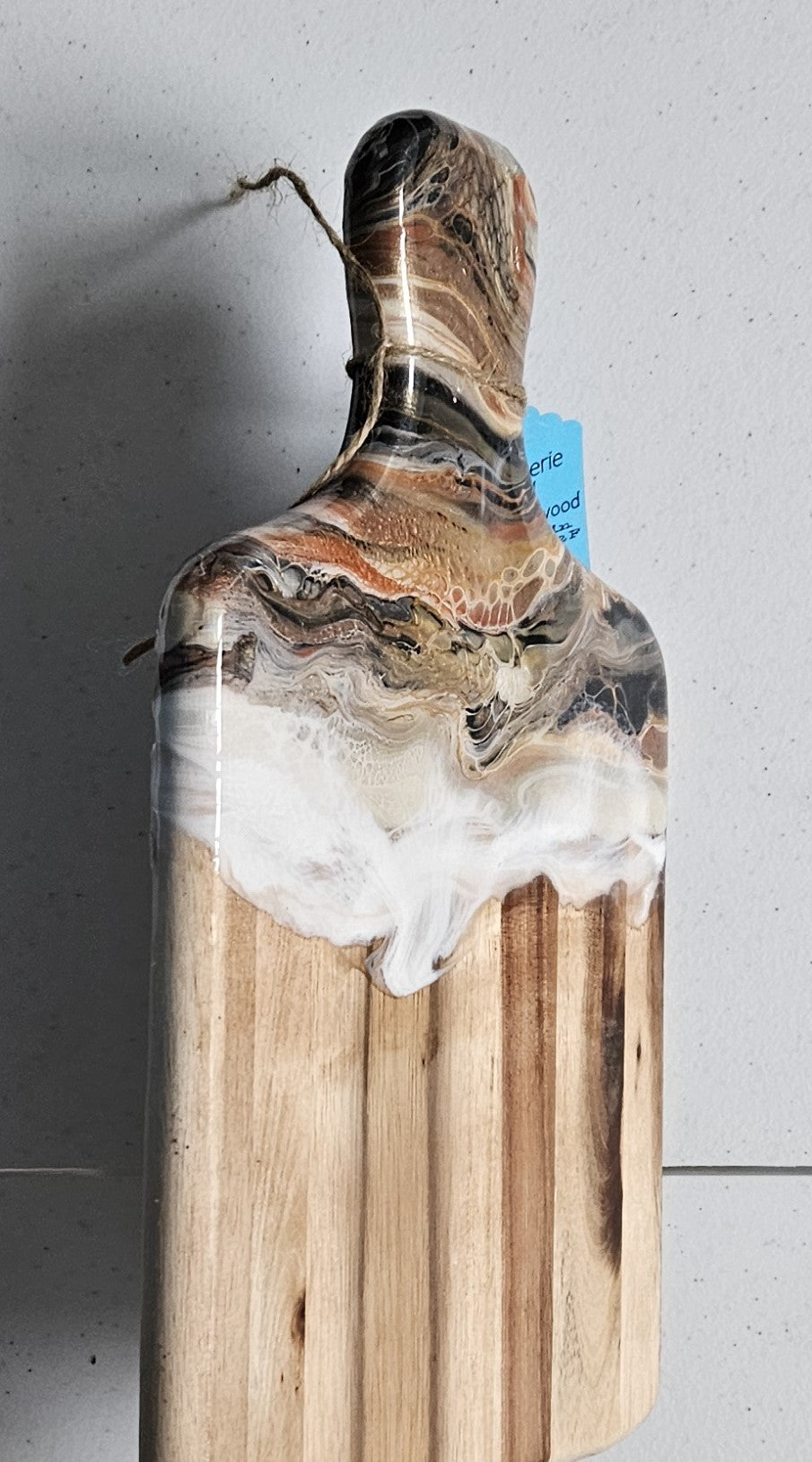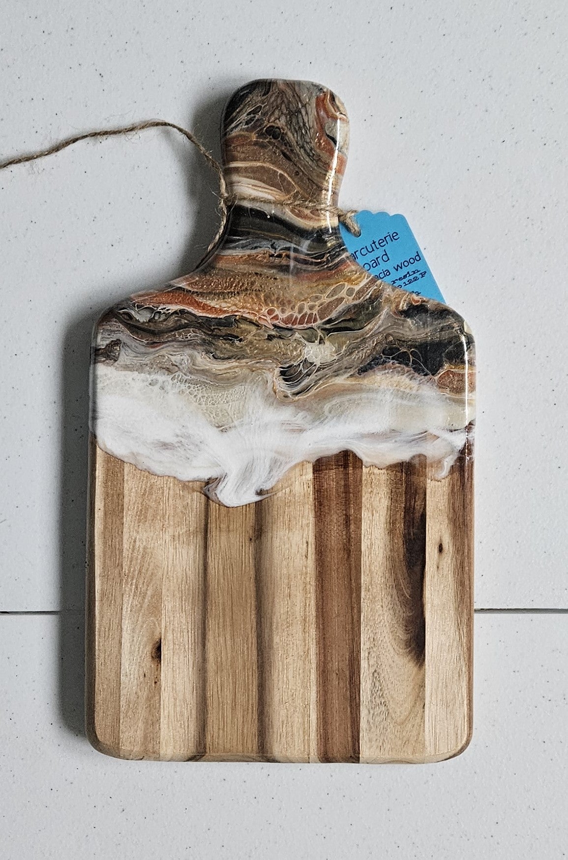 We apply fluid art on the end of the charcuterie and protect the art with a food safe, art grade resin. The resin can take heat up to 120 degrees Fahrenheit. Do not cut on the resin. Hand wash. After washing, you can recondition the wood using a food safe mineral oil. Windex works well to clean the resin.