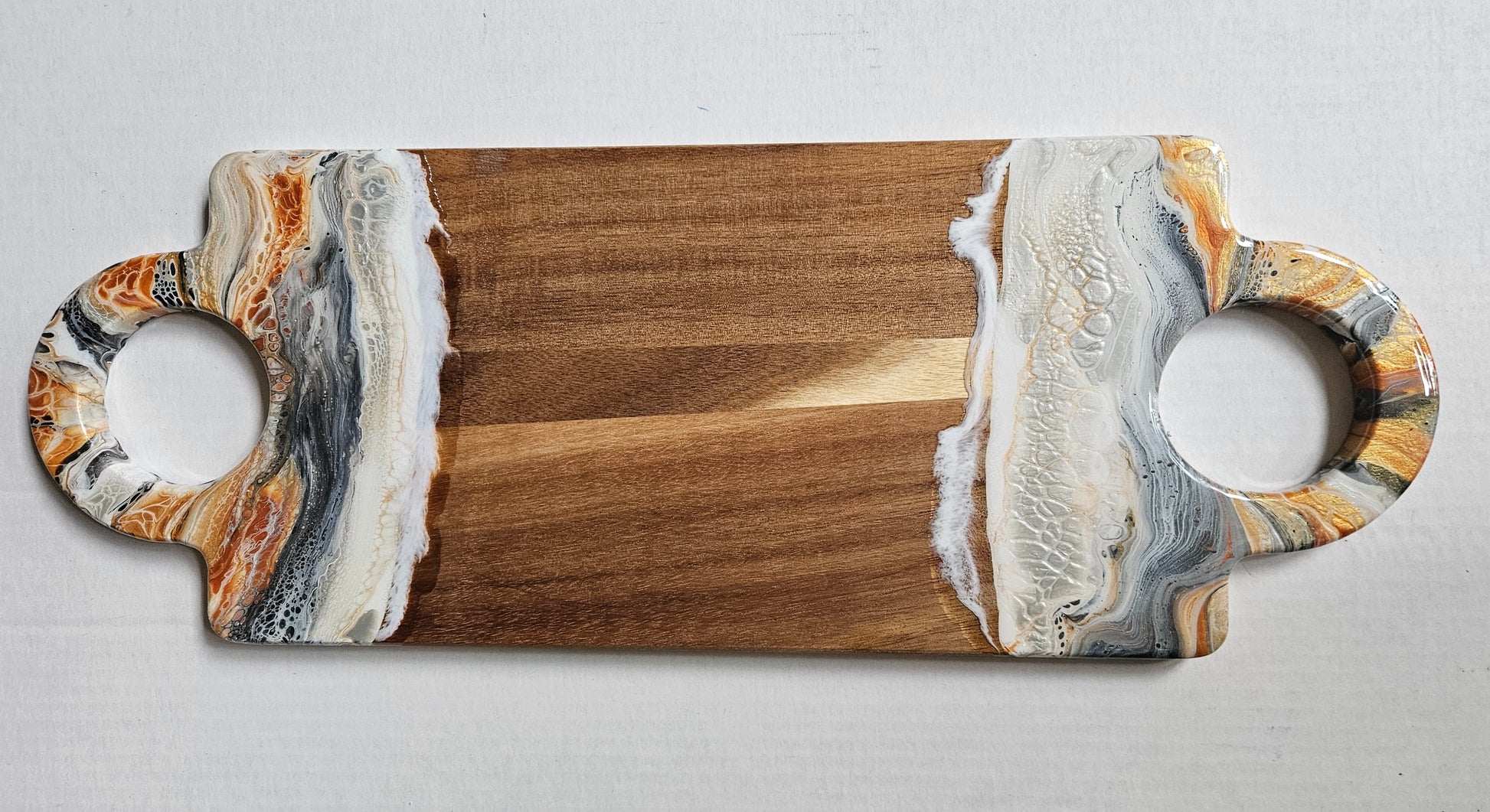 We apply fluid art on the end of the charcuterie and protect the art with a food safe, art grade resin. The resin can take heat up to 120 degrees Fahrenheit. Do not cut on the resin. Hand wash. After washing, you can recondition the wood using a food safe mineral oil. Windex works well to clean the resin.