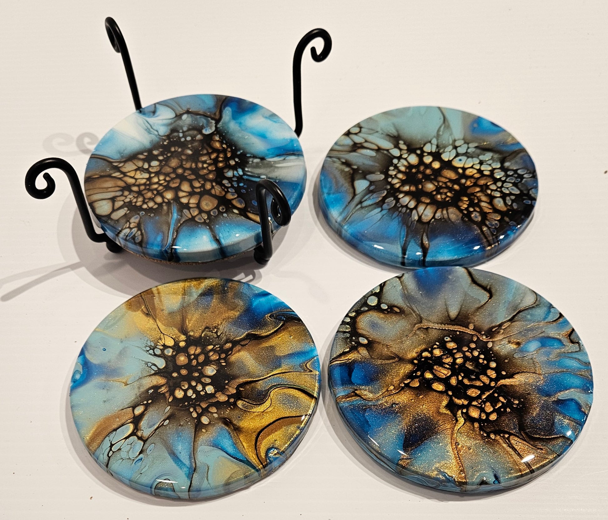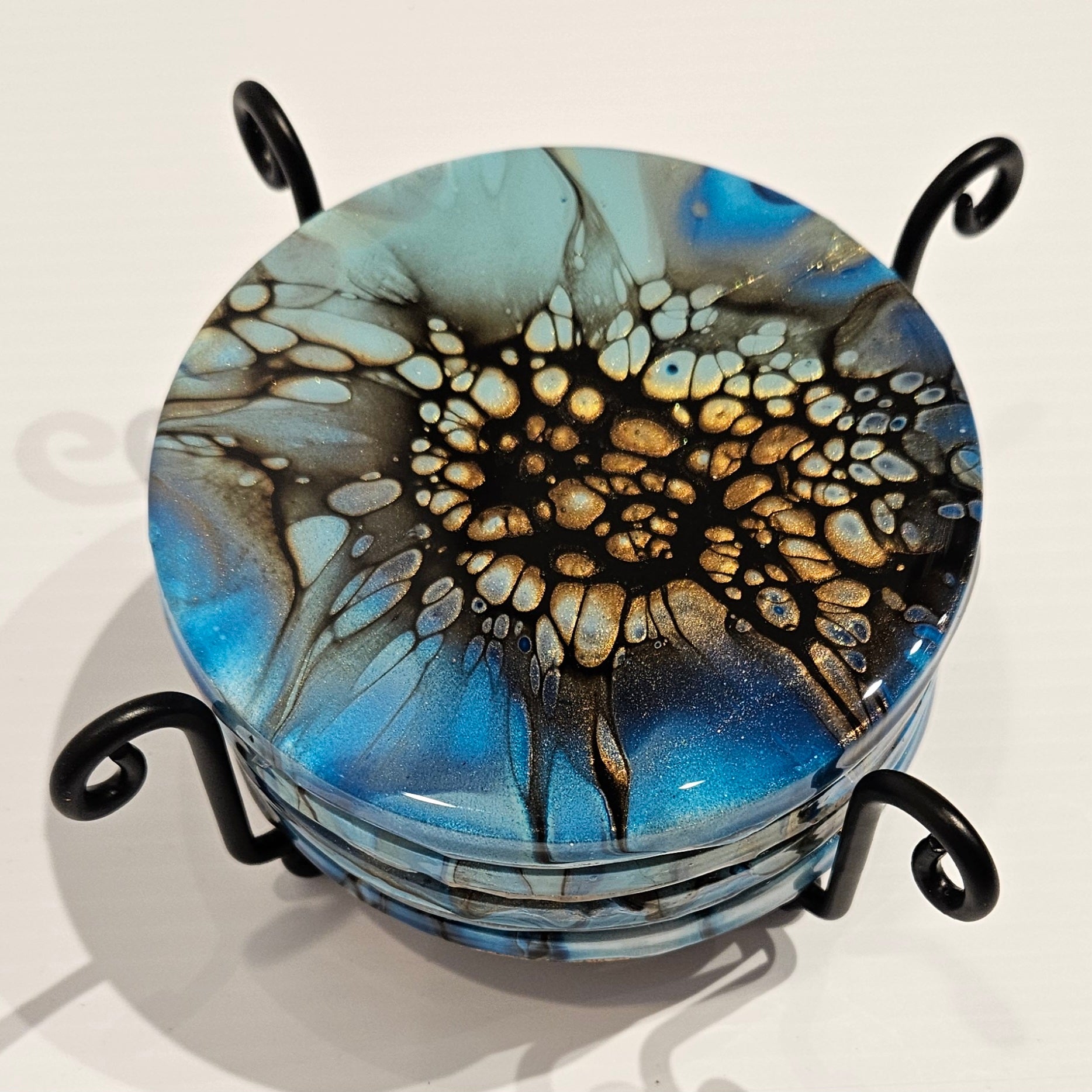 Coaster - Set of 4, Round with Holder - Blue/Gold 1