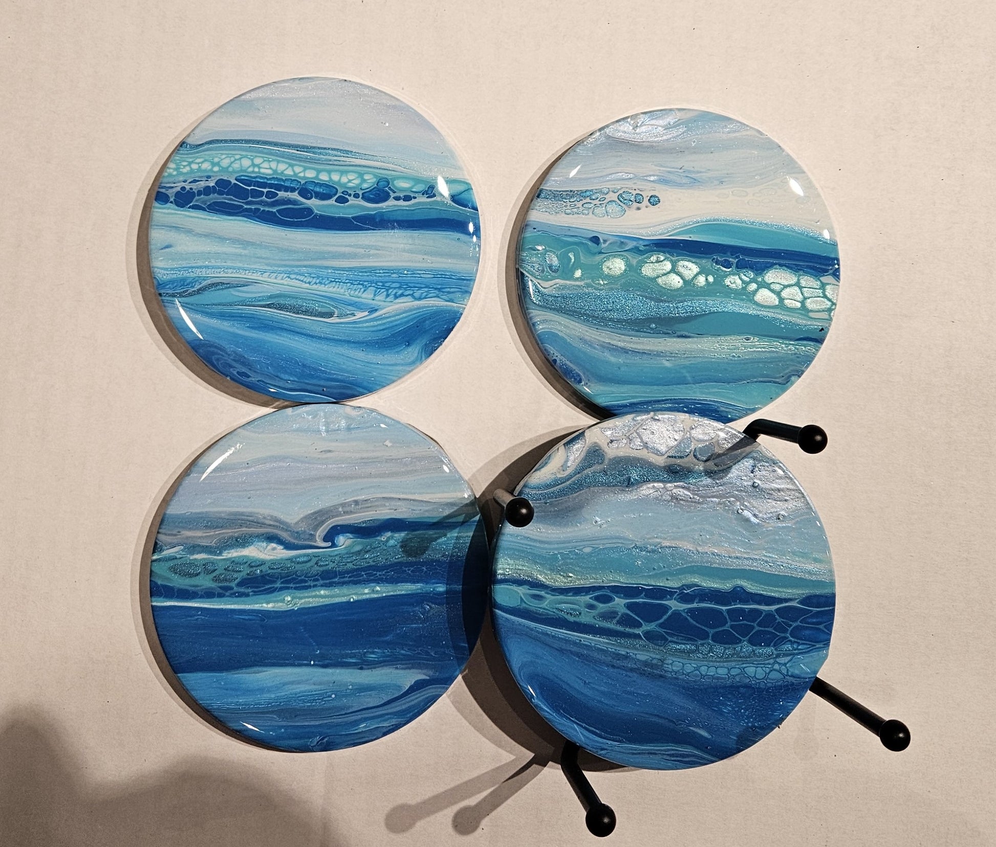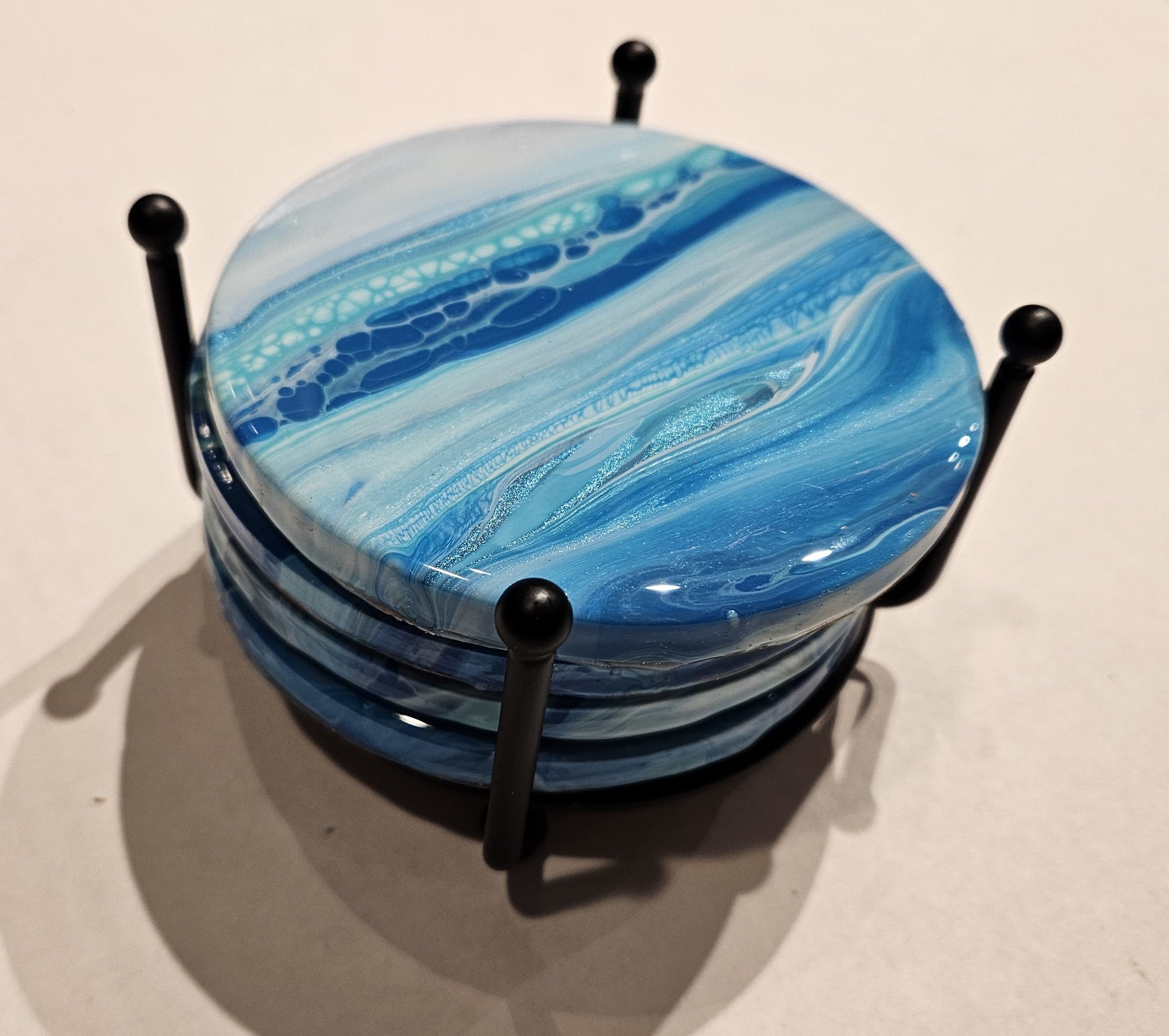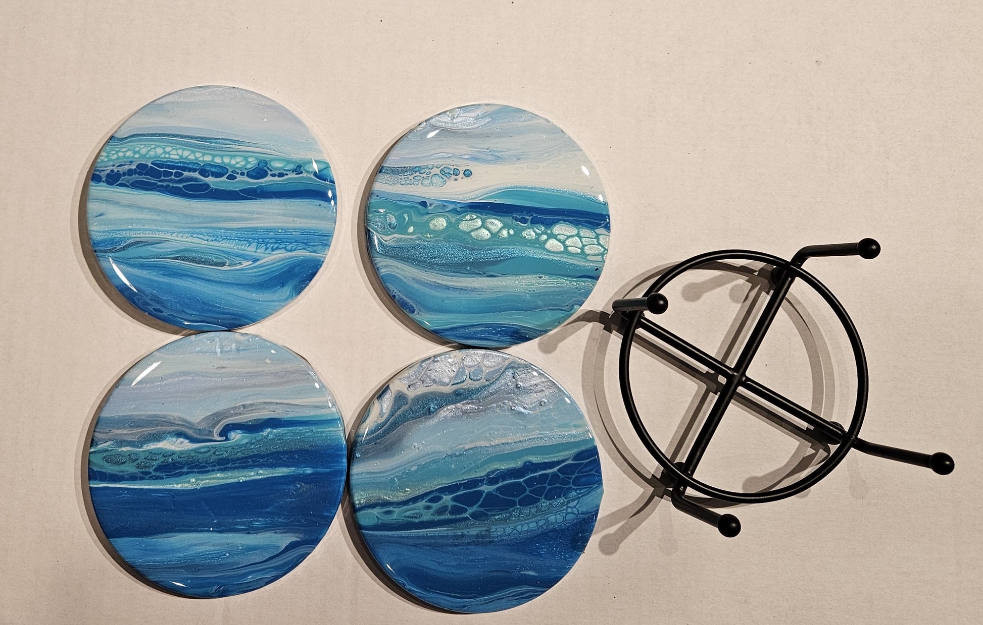 Enjoy your drink in style. Display your coasters on an end table or coffee table. Coasters come in a set of four, which we paint at the same time, so they have similar appearance. Coasters also come with a holder.