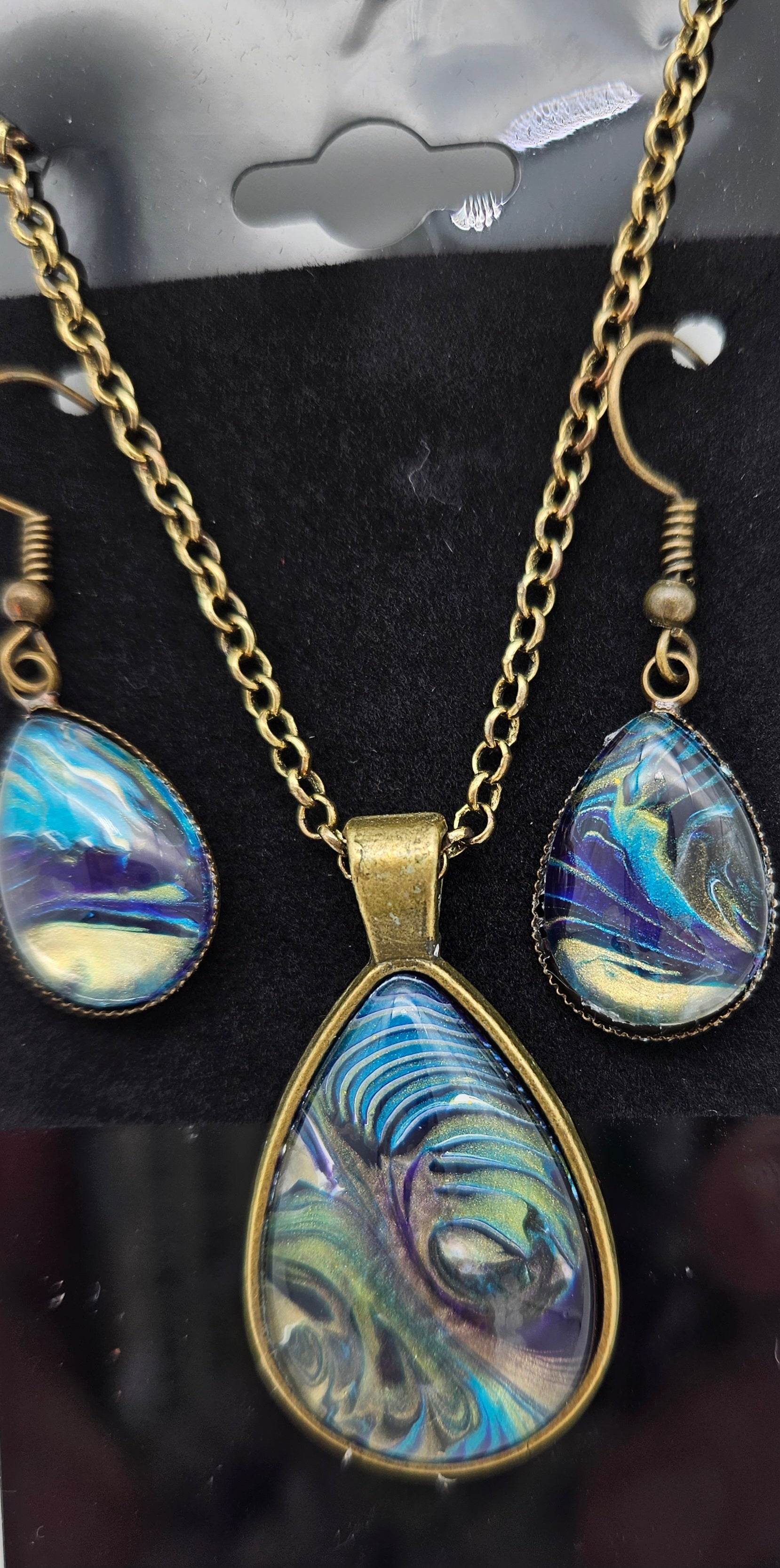Pendant earring set - Bronze - shades of blue & bronze- tear drop