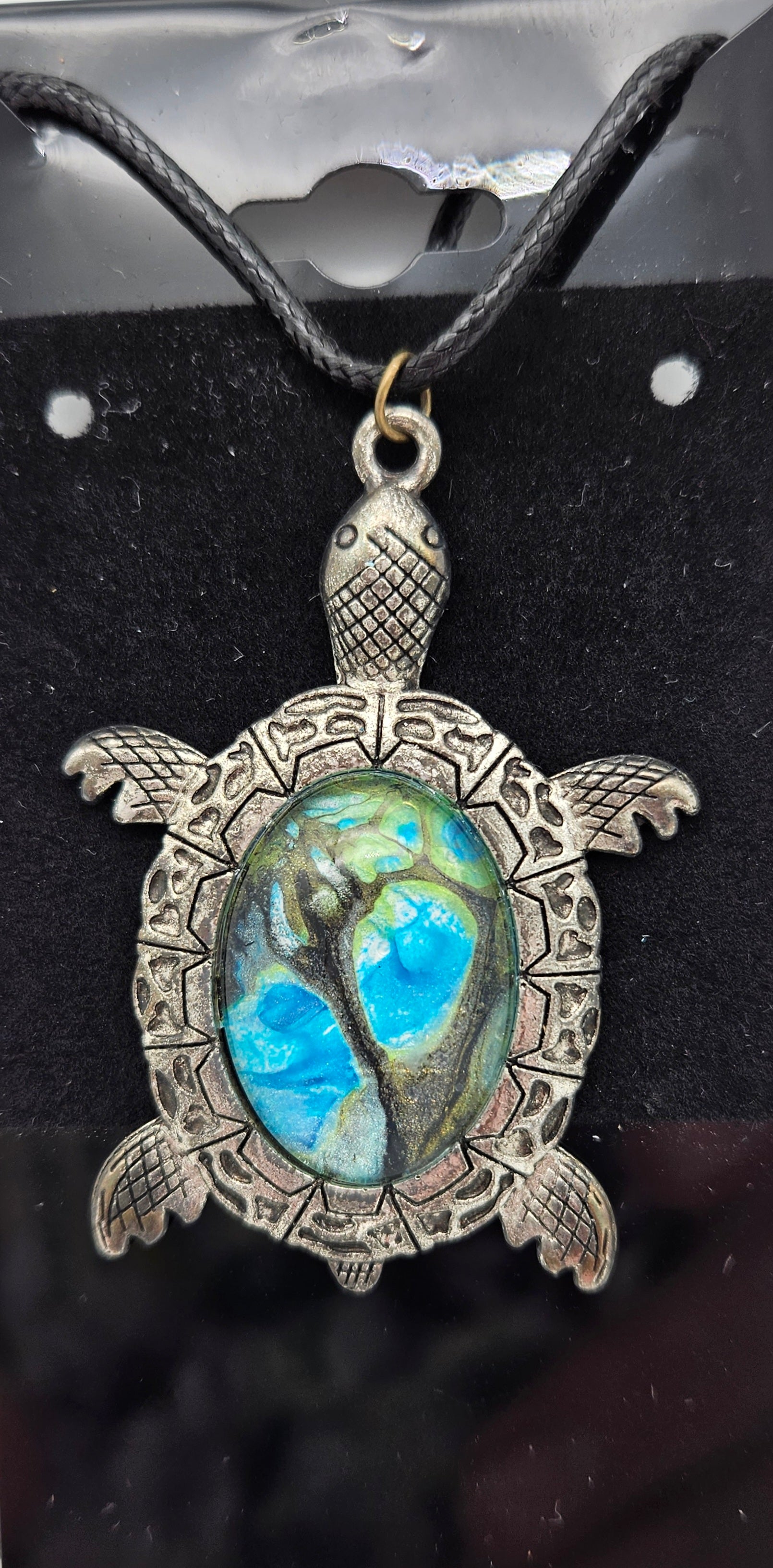 Pendant - Silver Turtle - Teal / Aqua / green cabochon