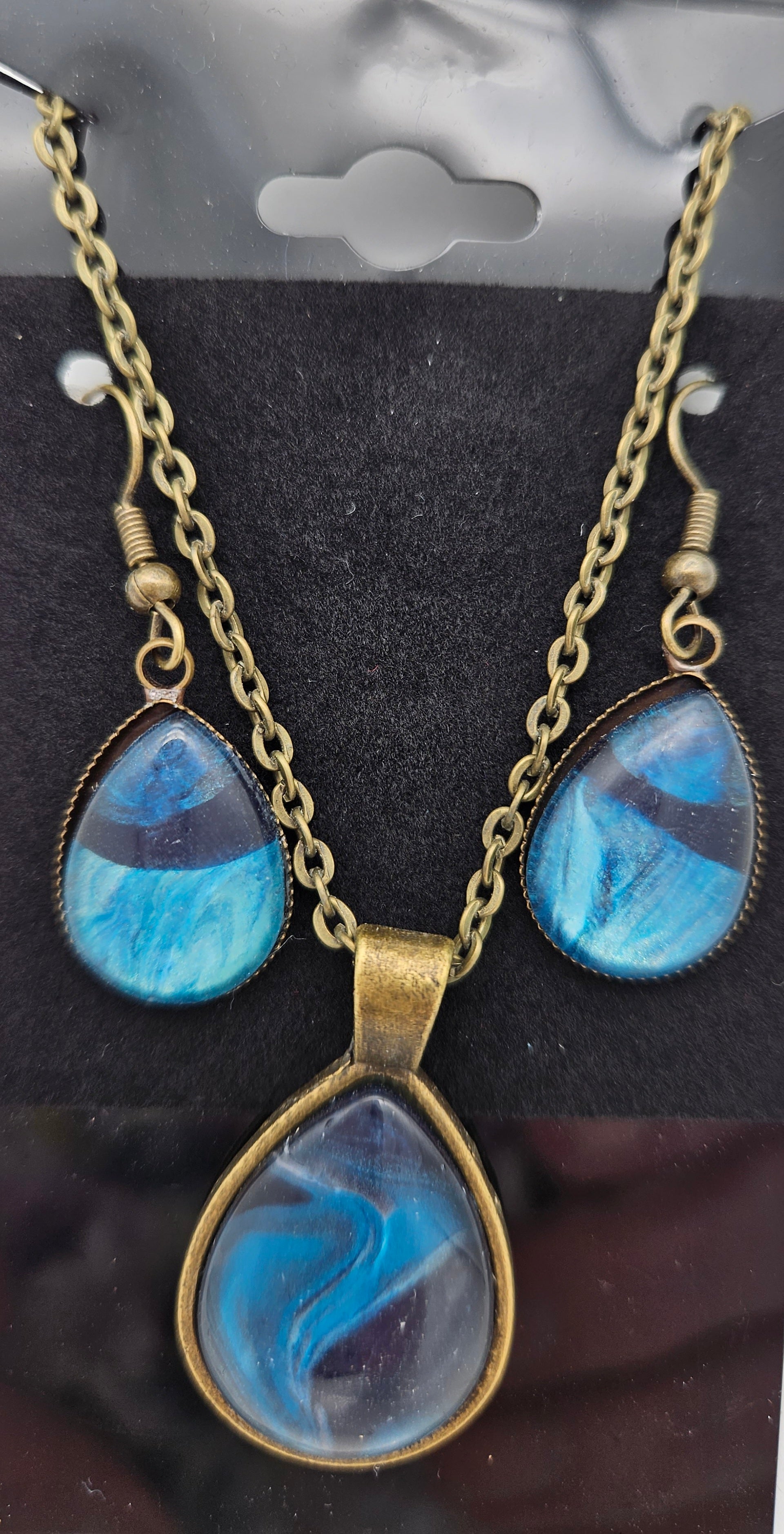 Pendant earring set - Bronze - shades of blue & bronze- tear drop