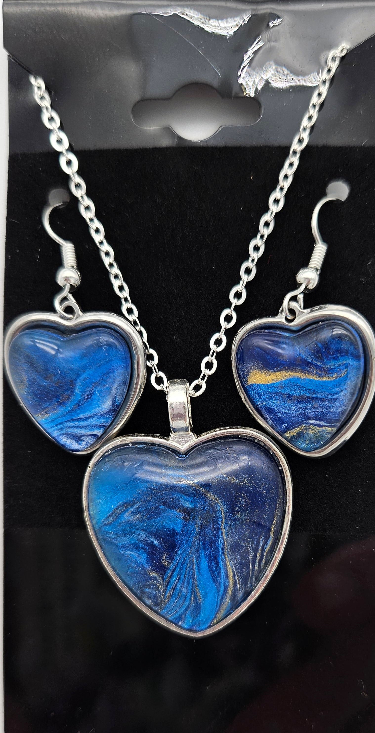 Pendant earring set - Silver - Shades of blue & Gold- heart shaped