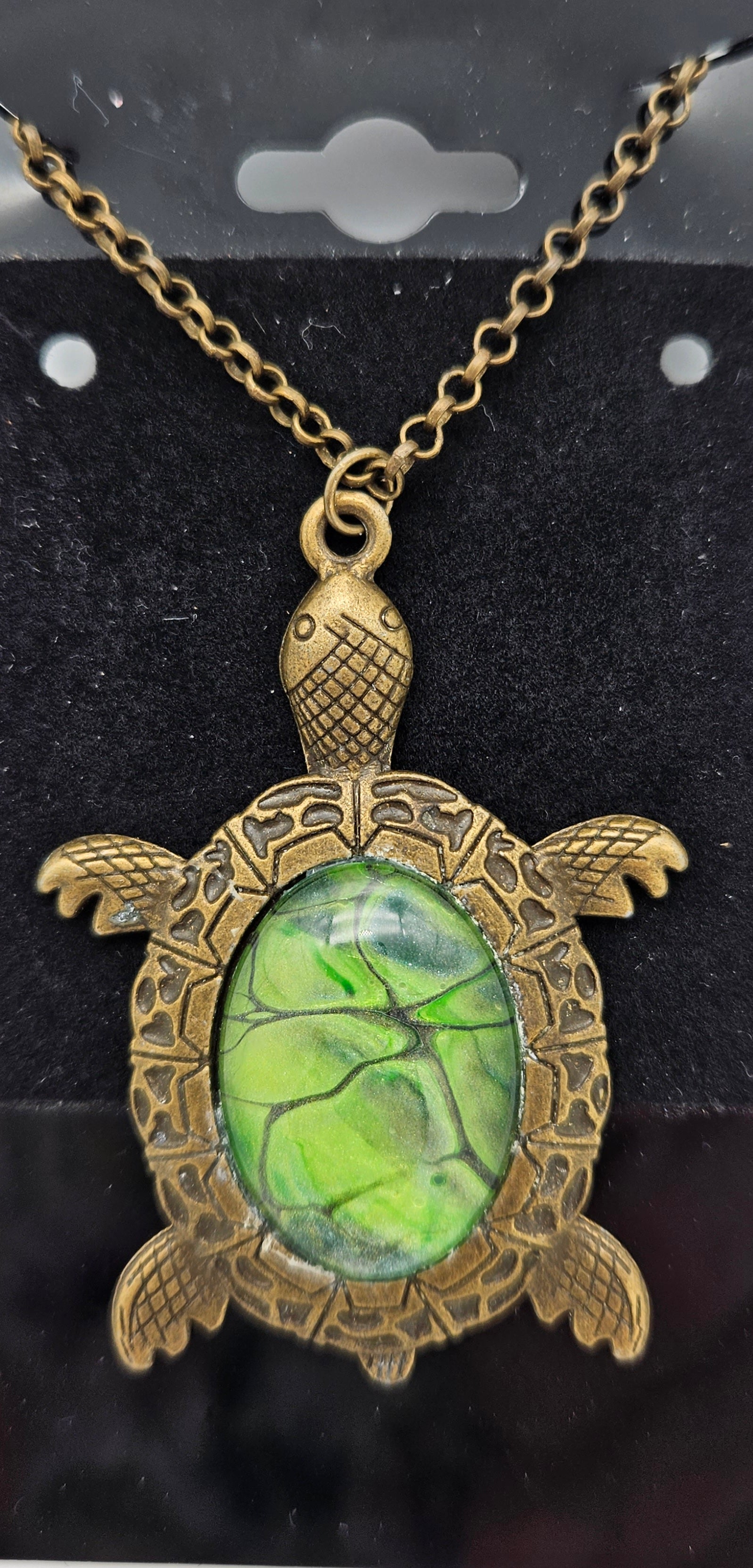 Cabochon is oval shaped, and hand painted with several shades of green and bronze, has sparkly pigment that doesn't show in the photo