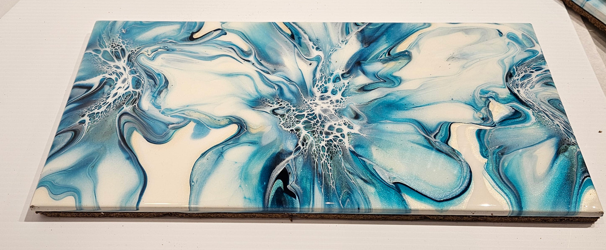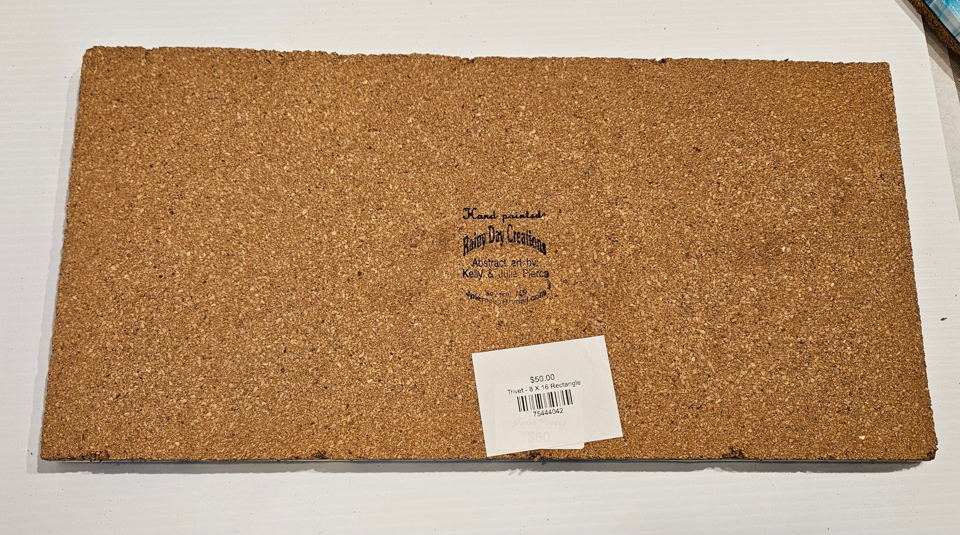 To make a trivet, we paint on ceramic tile and protect the paint with a high heat, art grade resin. We attach cork to the bottom of the trivet to protect your countertop from the tile.
