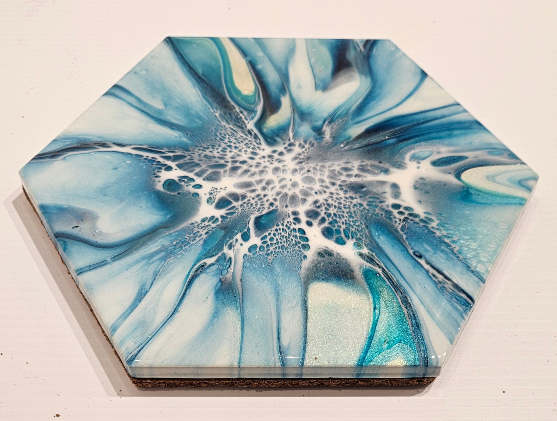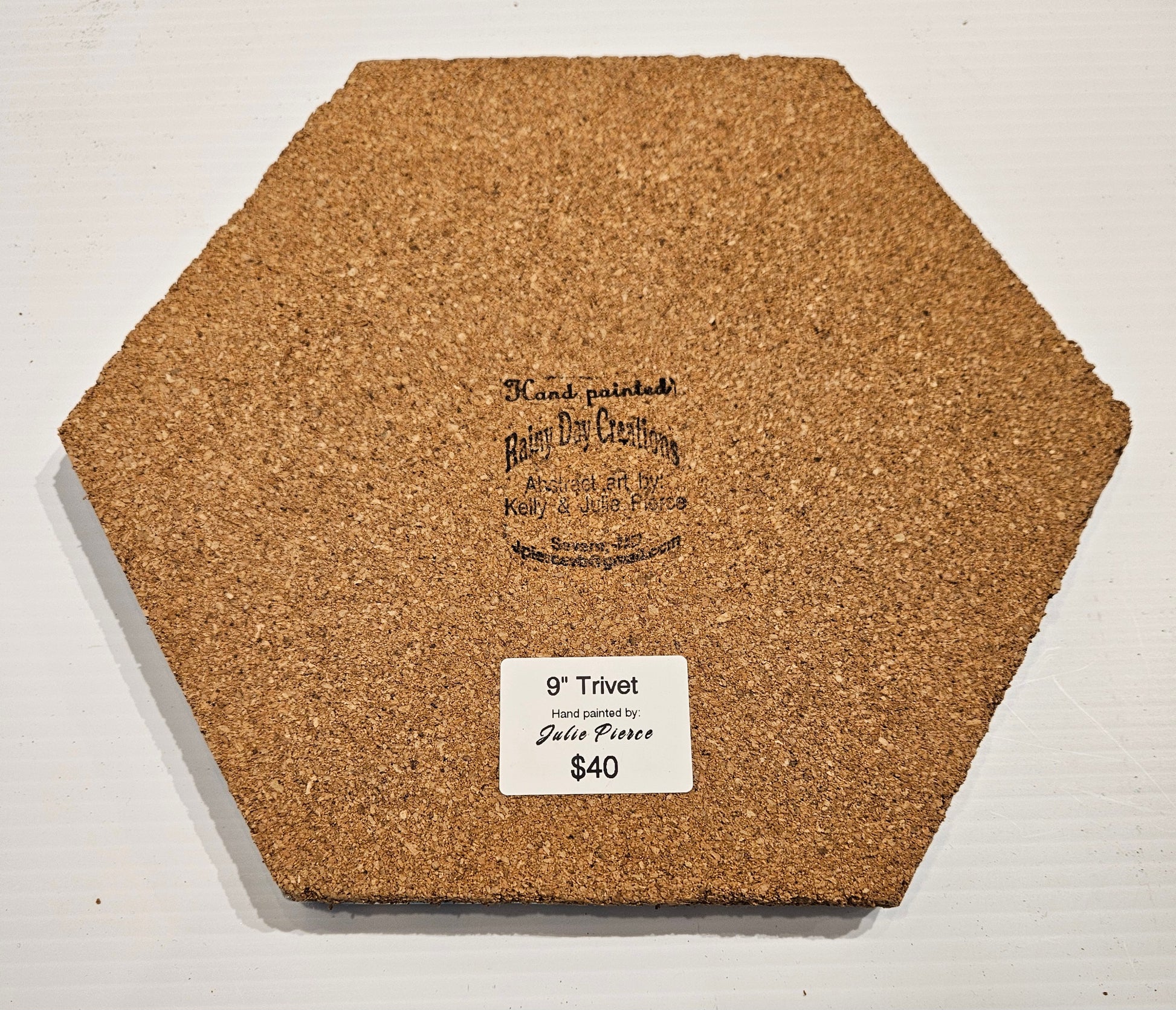 To make a trivet, we paint on ceramic tile and protect the paint with a high heat, art grade resin. We attach cork to the bottom of the trivet to protect your countertop from the tile.