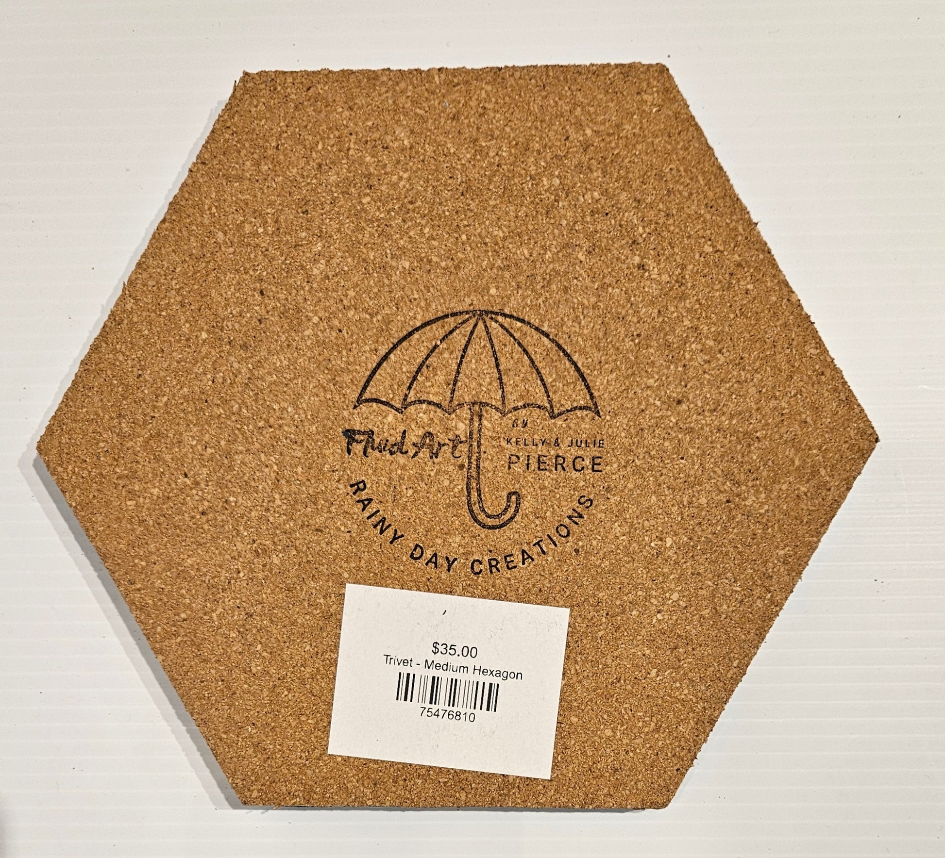 To make a trivet, we paint on ceramic tile and protect the paint with a high heat, art grade resin. We attach cork to the bottom of the trivet to protect your countertop from the tile.