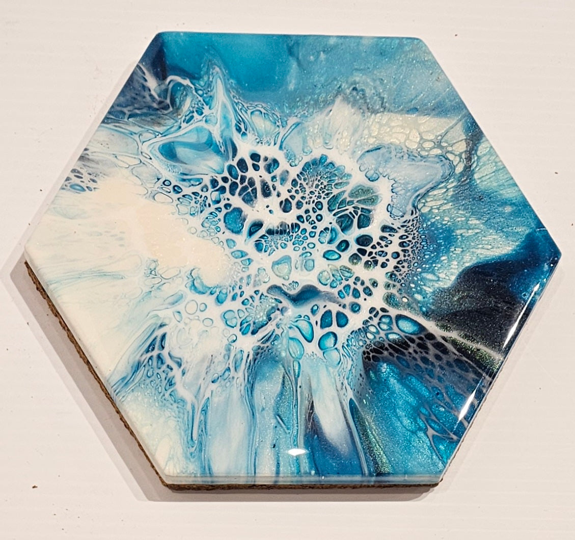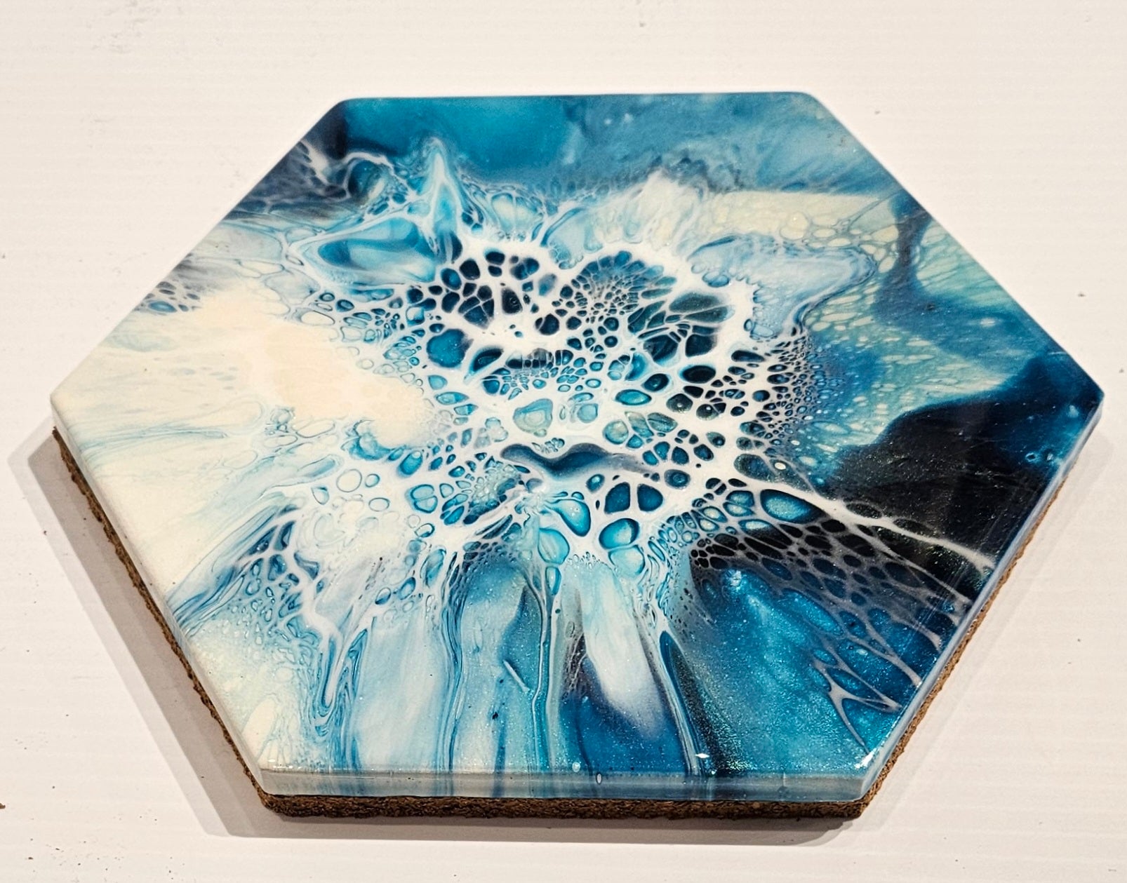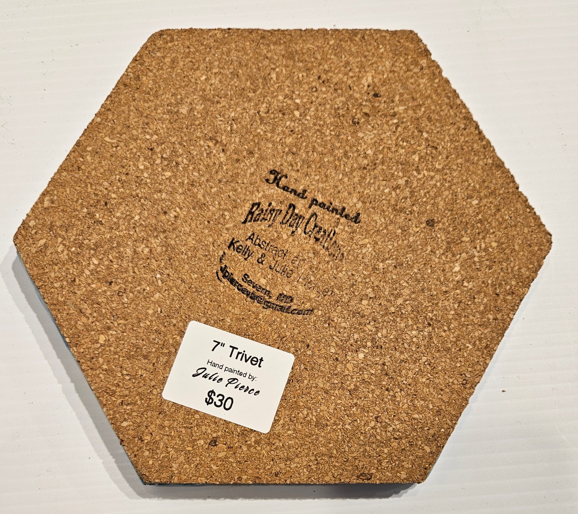 To make a trivet, we paint on ceramic tile and protect the paint with a high heat, art grade resin. We attach cork to the bottom of the trivet to protect your countertop from the tile.