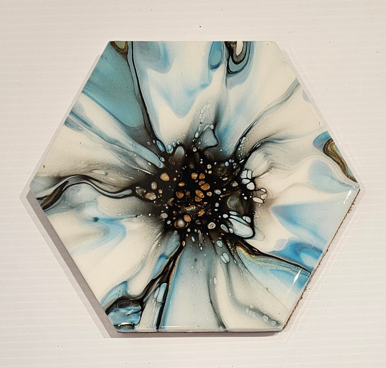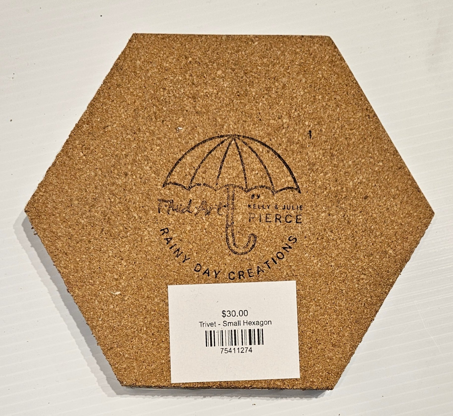 To make a trivet, we paint on ceramic tile and protect the paint with a high heat, art grade resin. We attach cork to the bottom of the trivet to protect your countertop from the tile.